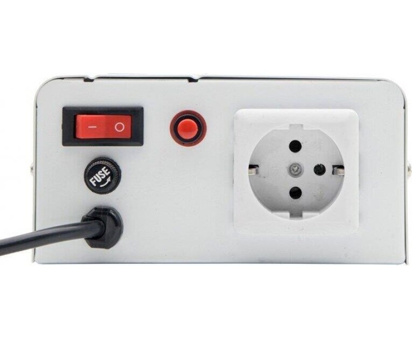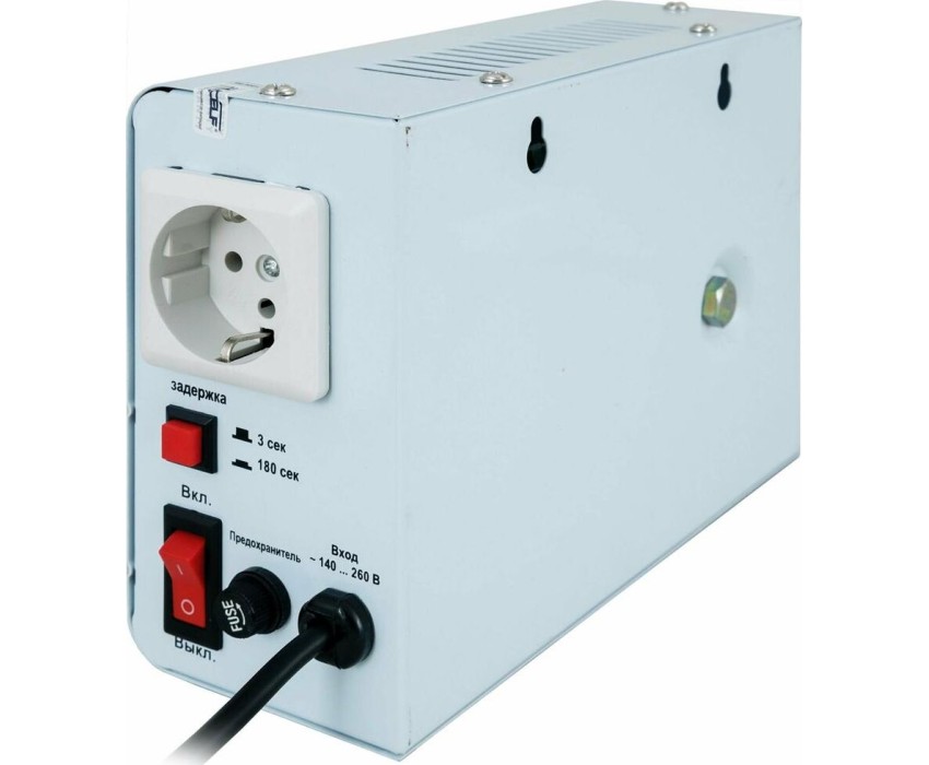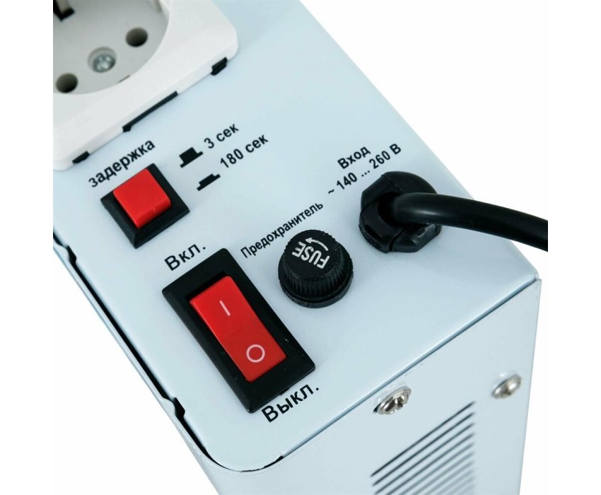 Тип стабилизации: Релейный. Мощность: 500 ВА. Диапазон стабилизации: 140-260 В. Рабочий диапазон: 130-275 В. Точность стабилизации: ±8%. Количество реле: 4. Частота: 50 Гц. Материал корпуса: металл. Кнопка выбора задержки выходного напряжения: есть (3 или 180 с). Габаритные размеры: 220х150х75 мм. Вес: 2,3 кг.