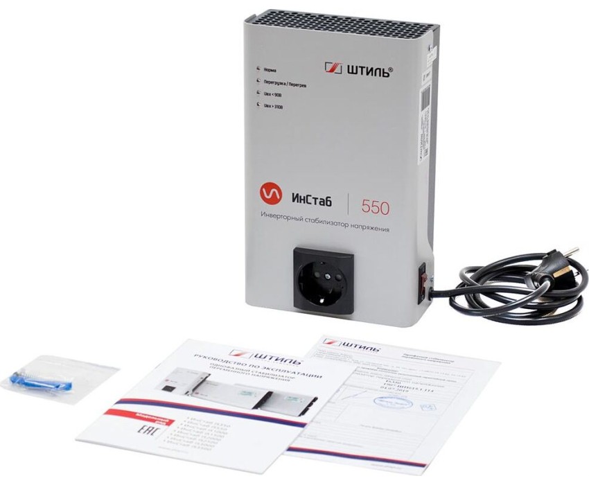 шуруп «саморез» 4,2x41 2шт, комплектация: стабилизатор напряжения IS550 1шт, гарантийный талон 1шт, шаблон для разметки поверхности 1 шт; мин. входное напряжение (предельное): 90 В; макс. входное напряжение (предельное): 310 В; мин. выходное напряжение (фазное): 216 В; макс. входное напряжение (рабочее): 310 В; макс. входная частота: 57 Гц; мин. входная частота: 43 Гц; мин. относительная влажность: 0 %; количество выходных розеток (общее): 1 шт.; время отклика: 0 мс, руководство по эксплуатации 1шт