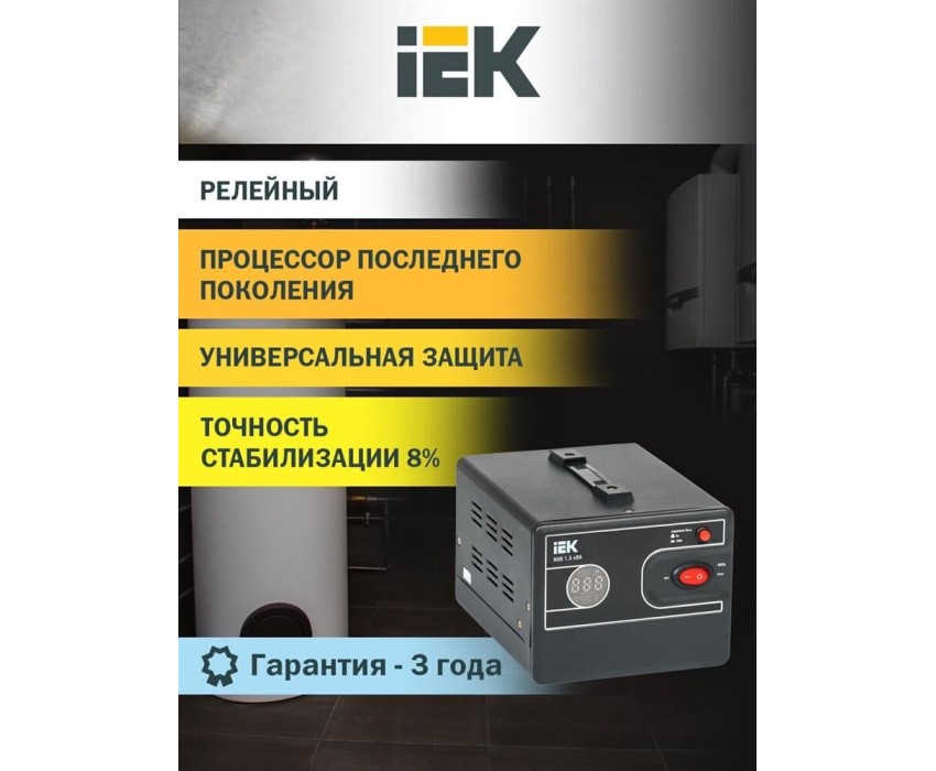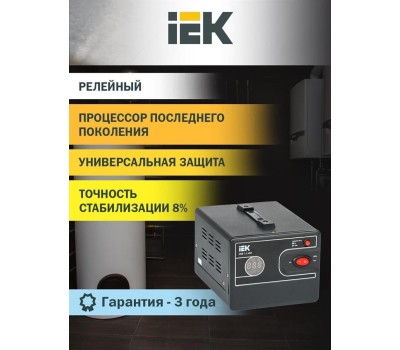 Тип стабилизации: релейная. Тип сети: однофазная. Рабочая частота сети: 50 Гц. Номинальная мощность: 1.2. Максимальная мощность: 1.32. Полная мощность: 1.5. Особенности: Релейные стабилизаторы напряжения IEK предназначены для поддержания стабильного однофазного напряжения питания нагрузок бытового и промышленного назначения (220В, 50Гц) при отклонениях сетевого напряжения в широких пределах по значению и длительности. Климатическое исполнение УХЛ4.. Охлаждение: естественное, воздушное. Класс защиты корпуса: IP20. Цвет: черный. Вес товара: 4.22. Габариты упаковки (ед) ДхШхВ: 0.3x0.22x0.2. Вес упаковки (ед): 4.56. Гарантия: 36 мес.. Входное напряжение: от 140 до 260 В. Выходное напряжение: 220 В ± 8%. Коэффициент полезного действия (КПД): 90%. Высоковольтная защита: 243В ± 4В. Время задержки: 20 мс. Рабочая температура: до 40 °С. Размеры (ШхВхГ): 19 х 15 х 23.5 см. Рабочая влажность воздуха: не более 90%. Охлаждение: естественное, воздушное. Мощность на выходе, номинальная: 1.2 кВт. Сеть: однофазная. Время задержки: 20 мс. Входное напряжение: от 140 до 260 В. КПД: 90%