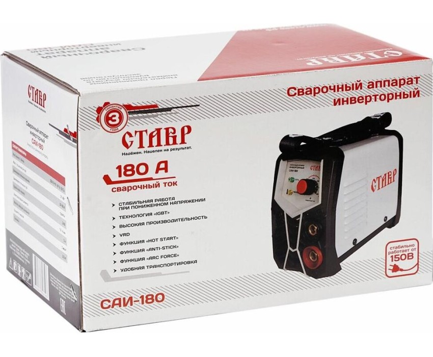 Тип сварки: ММА (ручная дуговая электродная). Напряжение сети / Частота: 220 В (+10; -30 %) / 50 Гц. Максимальная потребляемая мощность: 3,7 кВт. Максимальный потребляемый ток: 16,9 А. Род сварочного тока: постоянный. Диапазон сварочного тока: 20-180 А. Цикл работы: 120 А / 100 %; 180 A / 80 %. Напряжение холостого хода: 24 В. Диаметр электродов: 1,6 - 4 мм. Работа от генератора: 5 кВт. Класс изоляции: H. Класс защиты: IP 21. Работа от пониженного напряжения: от 150 В. Длина сетевого кабеля: 3 м. Масса: 2,3 кг.