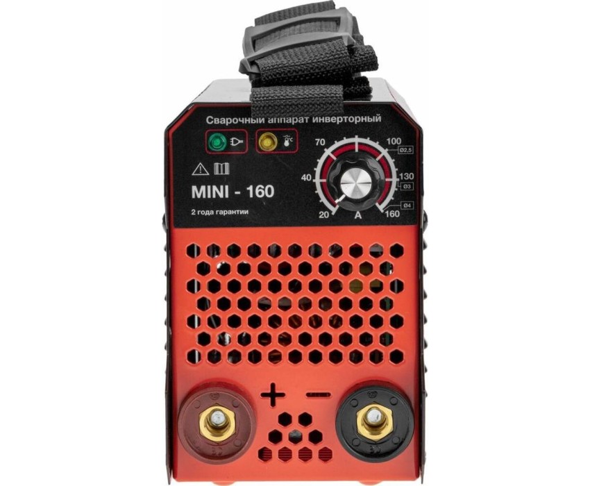 Сварочный аппарат инверторный REXANT MINI-160 представляет собой компактный, надежный и удобный прибор для сварки MMA. Подходит для бытового применения, для выполнения работ на строительных объектах, в гараже, в мастерской, на даче и в загородном доме. Аппарат работает от сети 220 В. Данная модель имеет компактный корпус, а также оснащена мягким ремешком, благодаря которому можно удобно размещать прибор на плече. Аппарат поддерживает обратную и прямую полярность при сварке и работает с электродами 2-3 мм. Обладает такими преимуществами, как функция антиприлипания электродов, плавная регулировка сварочного тока, легкий старт и отсутствие брызг при сварке. Характеристики: Напряжение питающей сети:220 +- 15% Частота питающей сети: 50-60 Гц Потребляемая мощность: 4 кВт Сварочный ток MMA: 20-160 А Рабочее напряжение ММА: 21,2-26,4 Напряжение холостого хода MMA: 50 В Потребление без нагрузки: 20 Вт Рабочий цикл: 60% Коэффициент мощности: 0,73 Класс изоляции: F Класс защиты: IP 21S