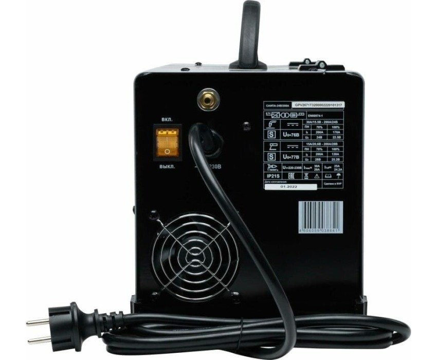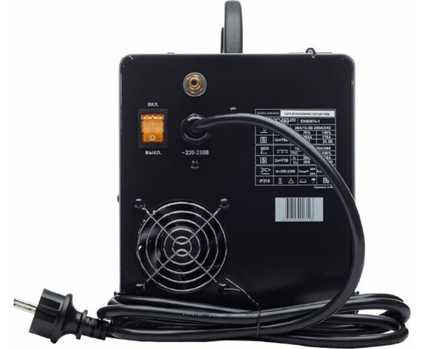 Тип преобразователя: инвертор. Максимальное напряжение холостого хода: 76. Продолжительность включения: 70%/200A. Форсаж дуги: регулируемый. Охлаждение: воздушное. Частота электросети: 50 Гц. Тип сети: однофазная. Класс изоляции: F. Класс защиты: IP21S. Вес товара: 9.3. Методы сварки: MIG-MAG. Потребляемая мощность: 6.9. Габариты упаковки (ед) ДхШхВ: 0.48x0.36x0.402. Вес упаковки (ед): 11.39. Страна производства: Китай. Тип электропитания: от электросети. Комплектация: Сварочный аппарат, кабель с горелкой, кабель заземления, наконечники, паспорт, упаковка.. Гарантия: 24 мес.. Сварочный ток: от 15.5 до 200 А. Размеры (ШхВхГ): 29 х 32 х 50 см. Диаметр электродов: от 1.5 до 5 мм. Диаметр проволоки, сталь: от 0.6 до 1 мм. Напряжение сети: 140-270 В. Функции: антизалипание, зажигание дуги отрывом. Методы сварки: MIG-MAG; ПВ = 70%/200A. Потребляемая мощность: 6.9 кВт. Напряжение сети: 140-270 В. Электроды: от 1.5 до 5 мм. Вес: 9.3 кг. Функции: антизалипание, зажигание дуги отрывом. Сварочный ток: от 15.5 до 200 А