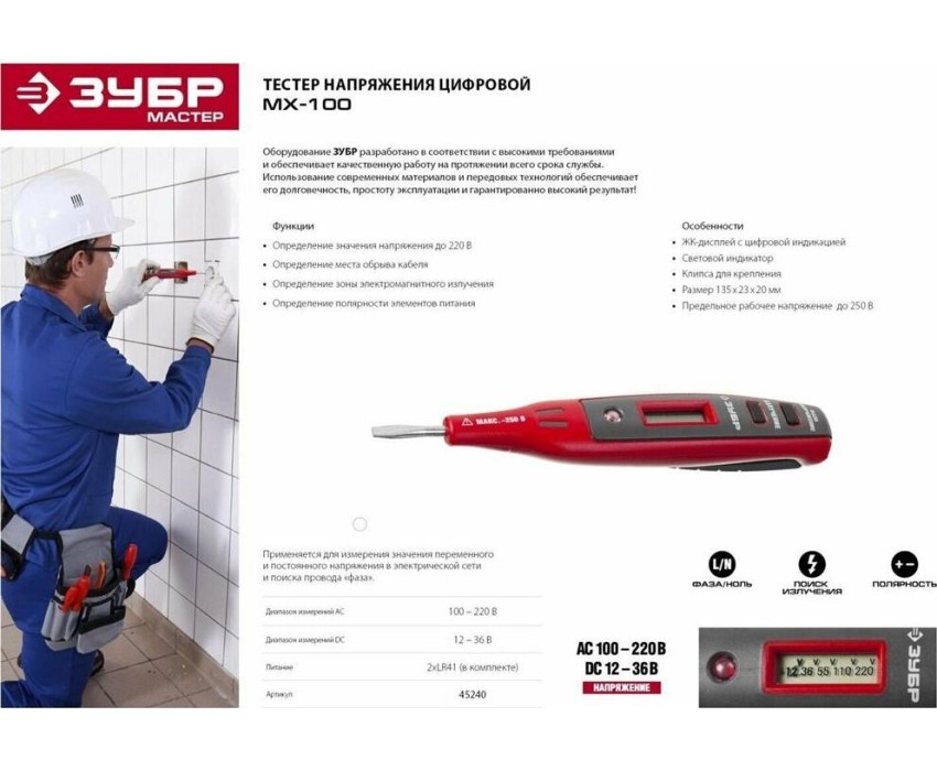 Тестер ЗУБР "Мастер" 45240 цифровой, со световым индикатором