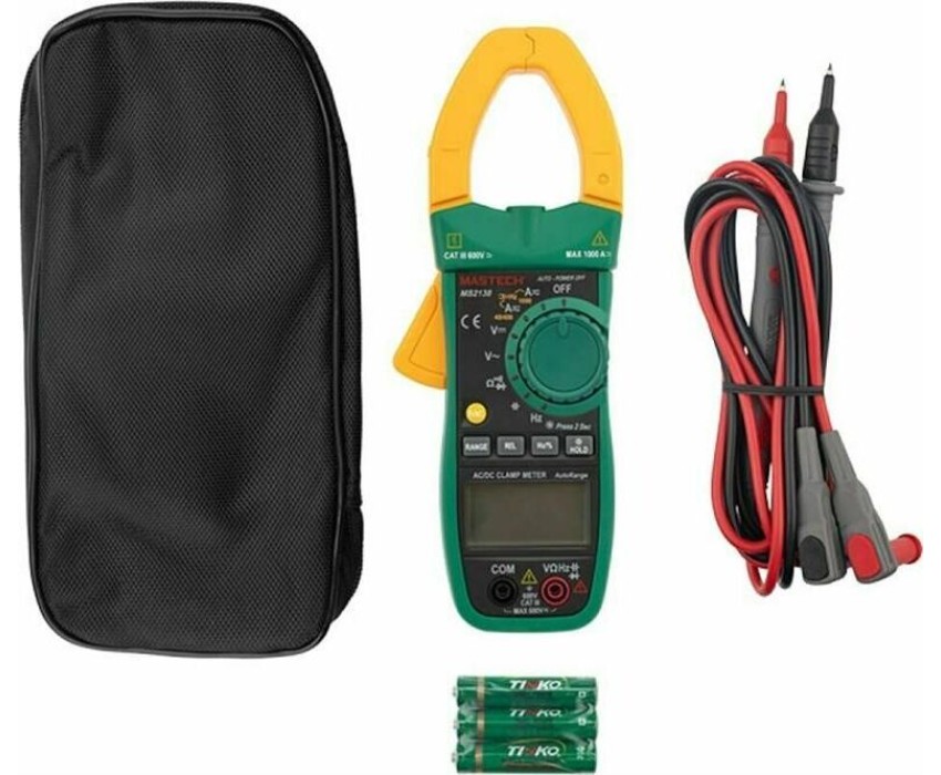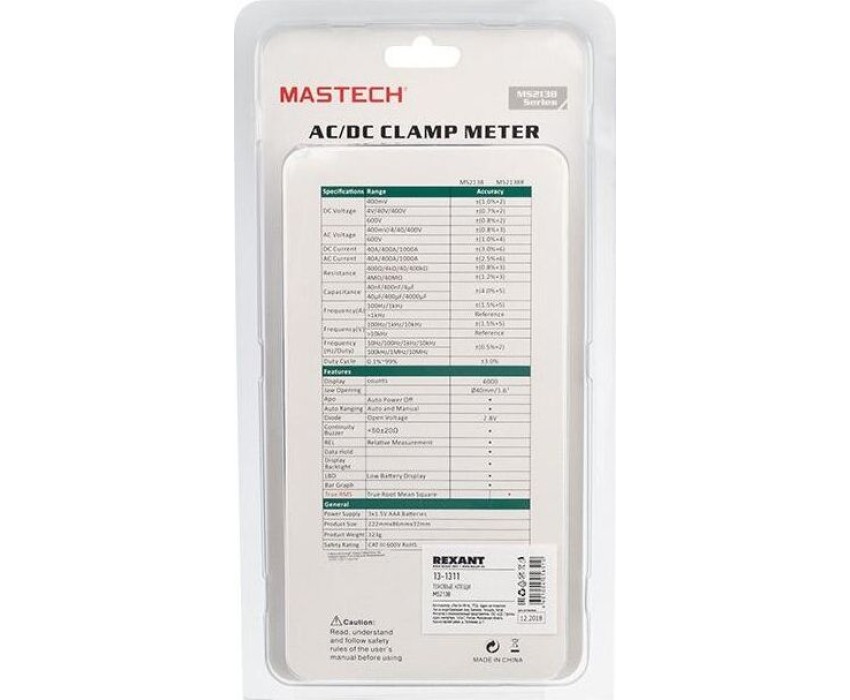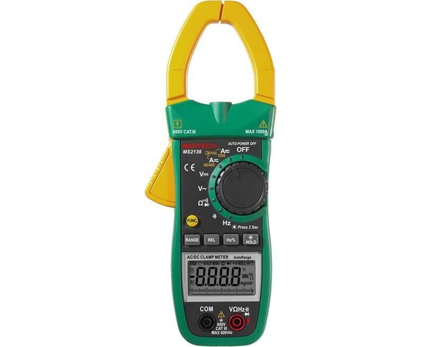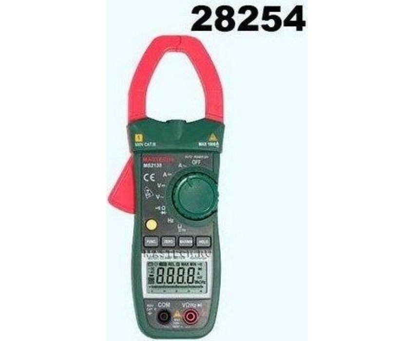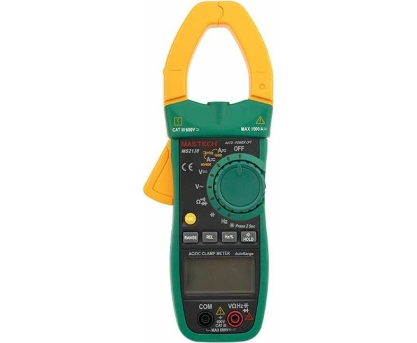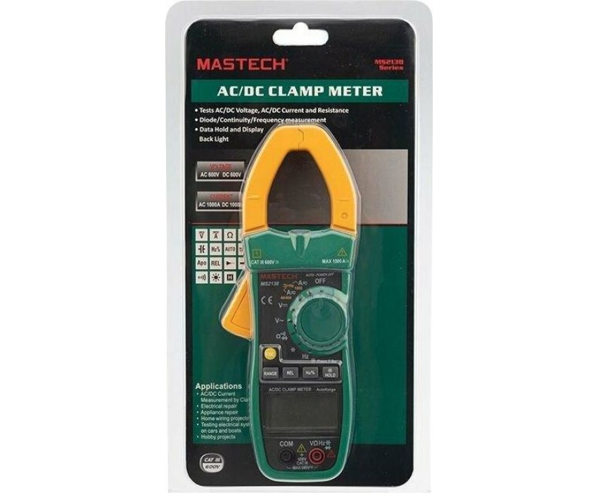 Токовые клещи MASTECH MS2138 позволяют измерять бесконтактным способом силу тока, а также с помощью щупов измерять величину напряжения, сопротивления и частоту. Прибор полностью соответствует стандартам электробезопасности. В токовых клещах MASTECH MS2138 предусмотрена подсветка дисплея для читаемости полученных результатов в условиях недостаточной видимости, а также подсветка раскрыва клещей для видимости объекта измерений. ; С помощью кнопки DATA HOLD можно зафиксировать последний полученный результат. Прибор автоматически отключится в случае длительного простоя. В токовых клещах MASTECH MS2138 предусмотрена также функции проверки диодов и прозвонка электрической цепи на качество соединения. ; ; Характеристики: ; Разрядность шкалы дисплея: 4000 отсчетов; Бесконтактное измерение частоты тока в клещах: 0,01 Гц…~1 кГц, погрешность ±1,5% ±5 единиц счета; Автоматический выбор пределов измерений; Возможность ручно