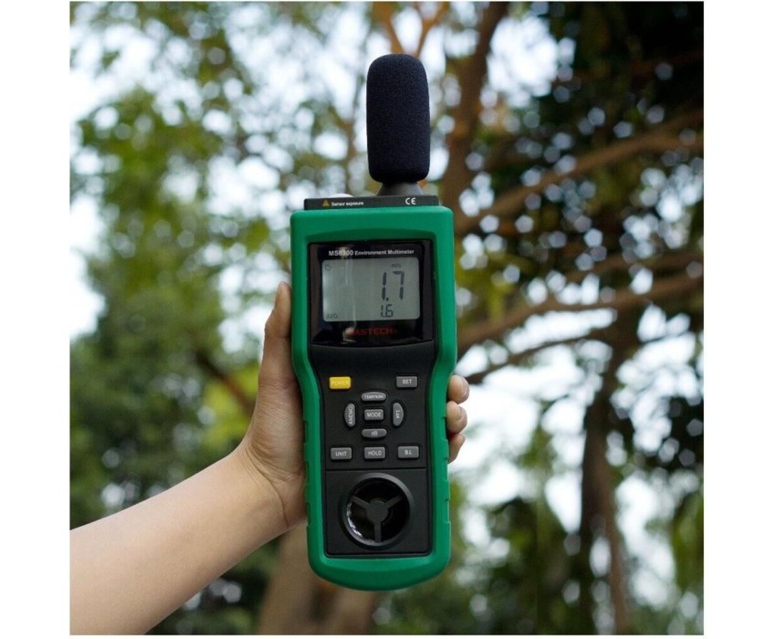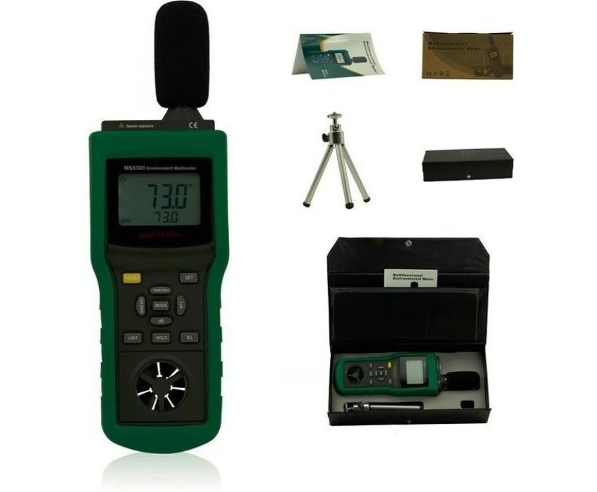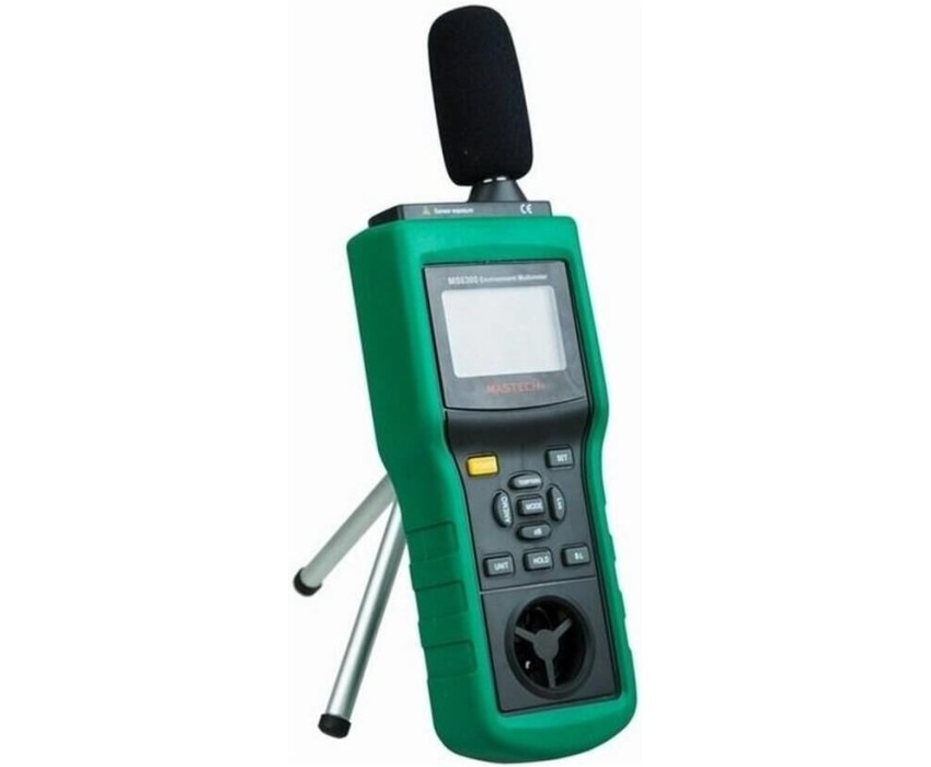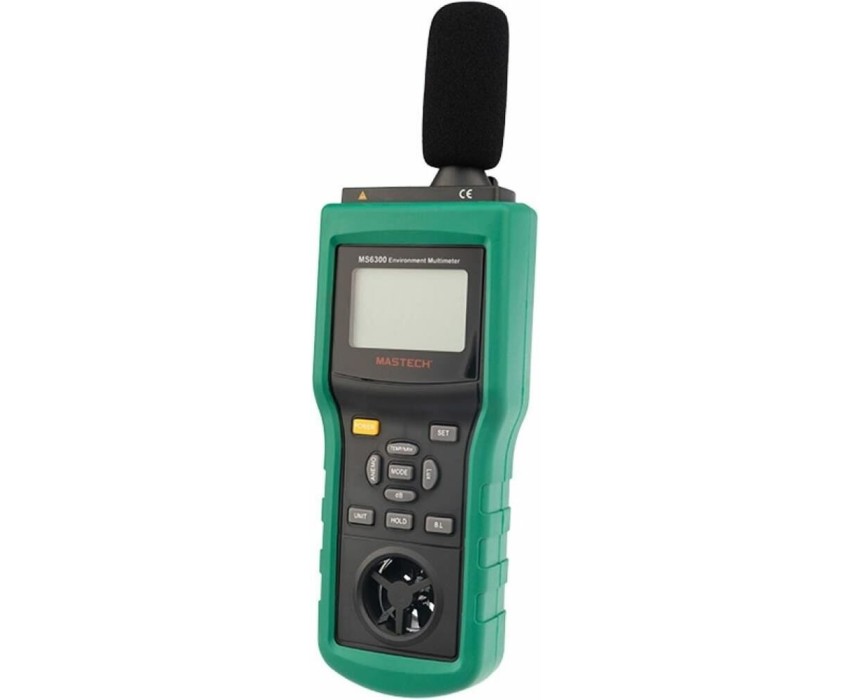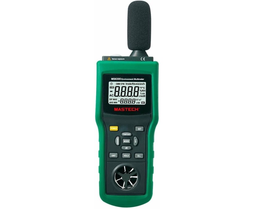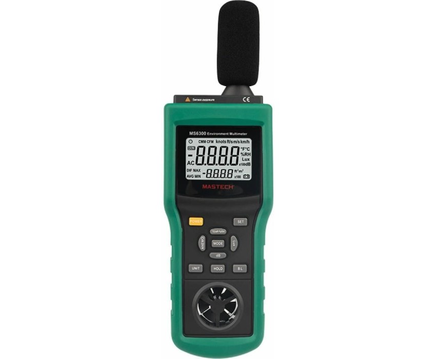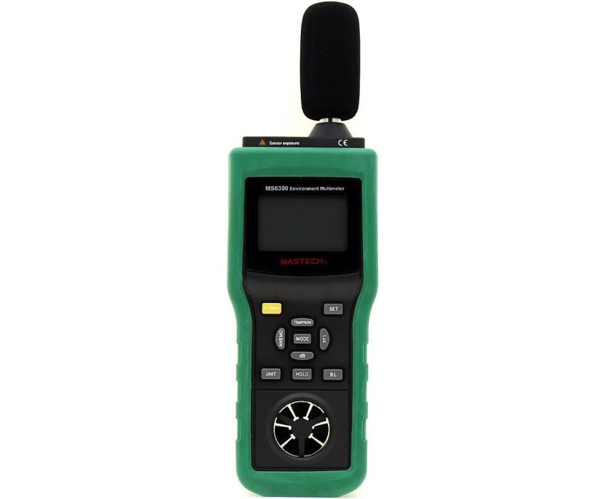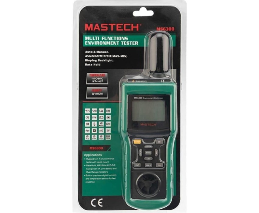 Многофункциональный тестер окружающей среды MASTECH MS6300 представляет собой цифровой многофункциональный измеритель параметров окружающей среды, совмещающий в себе функции измерения уровня звука, освещенности, относительной влажности, температуры. давления и скорости ветра. . Прибор является портативным профессиональным измерительным инструментом с большим жидкокристаллическим дисплеем с подсветкой для удобства считывания данных. Многофункциональный тестер окружающей среды MASTECH MS6300 обладает множеством функций для удобства в работе, такими как: функцией автоматического и ручного выбора предела измерений, функцией фиксации последних измерений, функцией измерения максимального (MAX), минимального (MIN), среднего (AVG) и разностного (DIF=MAX-MIN) значений.
