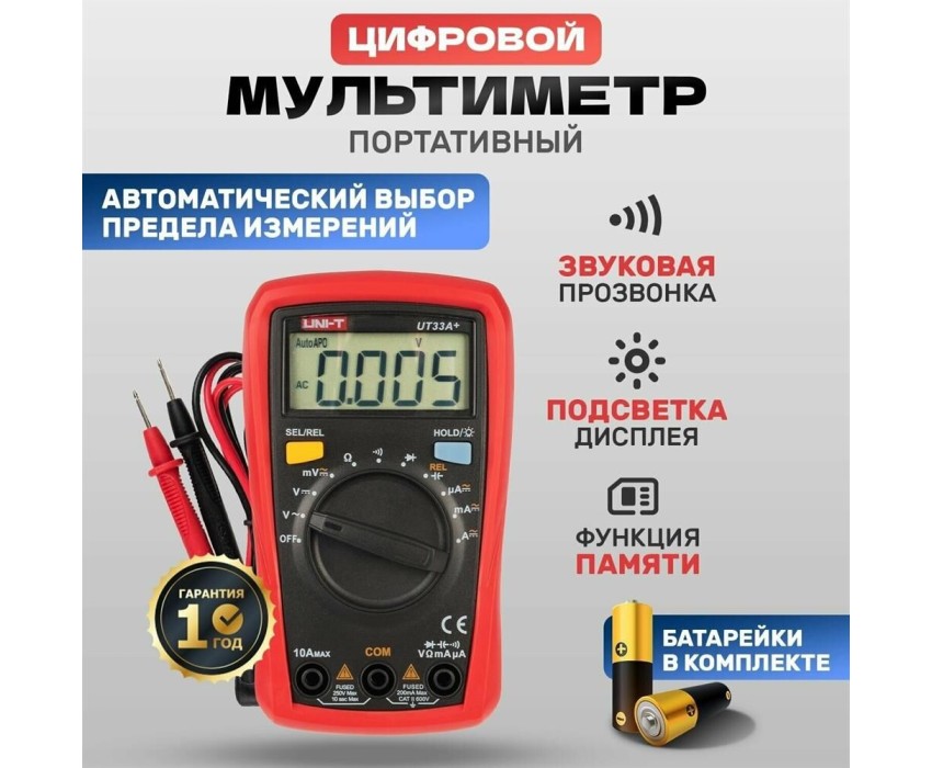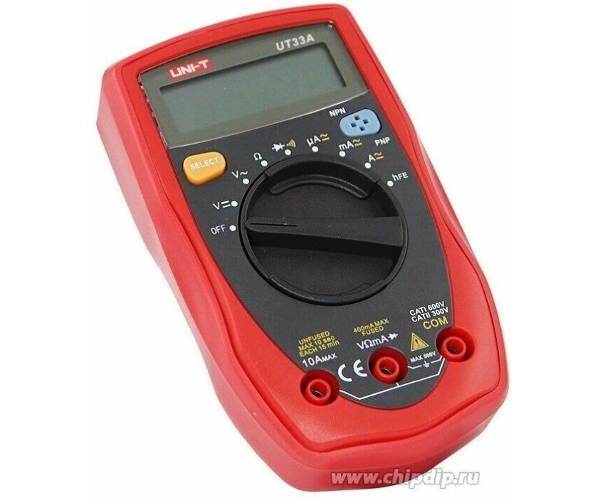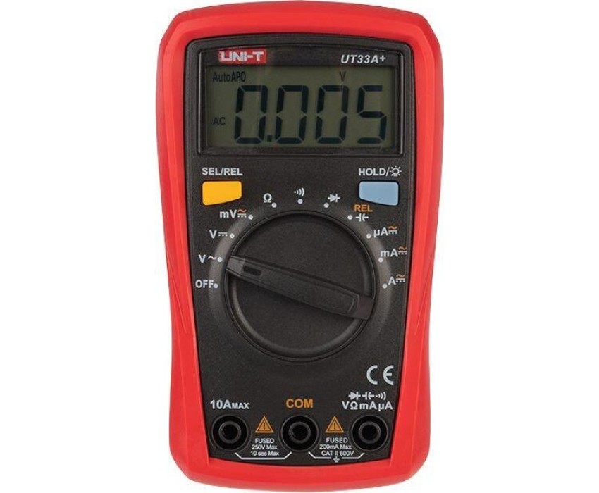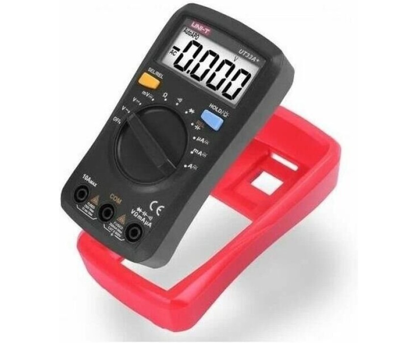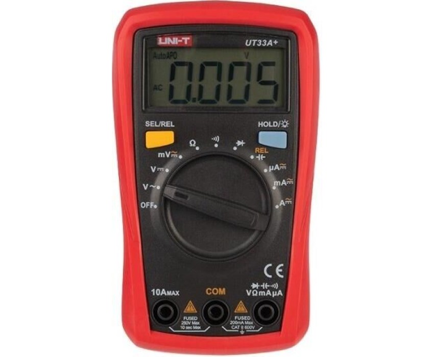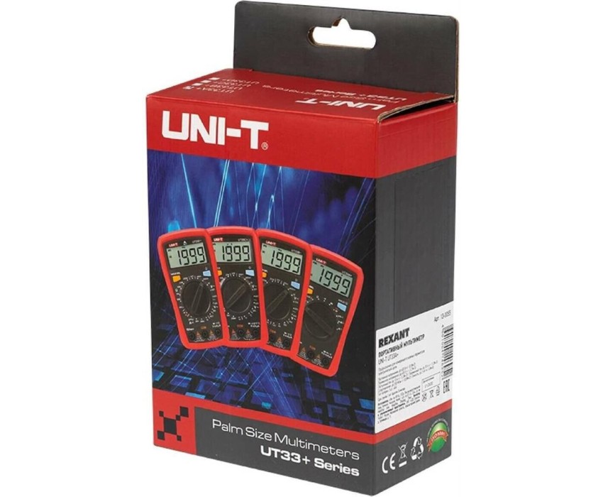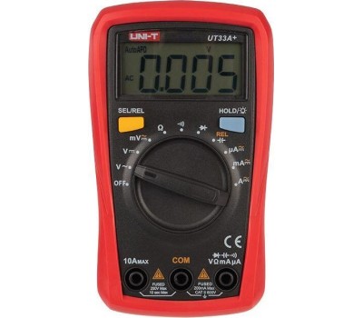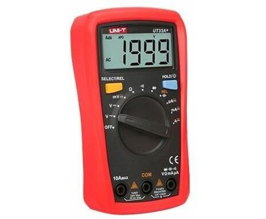 Мульти́метр — электроизмерительный прибор, который включает в себя несколько функций и набор измеряемых параметров. Все приборы серии UT-33+ измеряют постоянное и переменное напряжение, постоянный и переменный ток и сопротивление в цепи. А также с помощью данного прибора можно проводить тестирование диодов, транзисторов, батареек и осуществлять прозвонку целостности цепи. Прибор UT33A+ является портативным мультиметром, компактные размеры позволяют всегда носить его с собой. Но, несмотря на малые размеры, данный мультиметр обладает широким функционалом и это выгодно отличает его от других. Инженеры старались сделать прибор максимально удобным для использования. Выбор измеряемых величин производится с помощью усиленного поворотного регулятора, благодаря которому исключается возможность случайного нажатия. UT33A+ имеет функцию автоматического выбора пределов измерений.