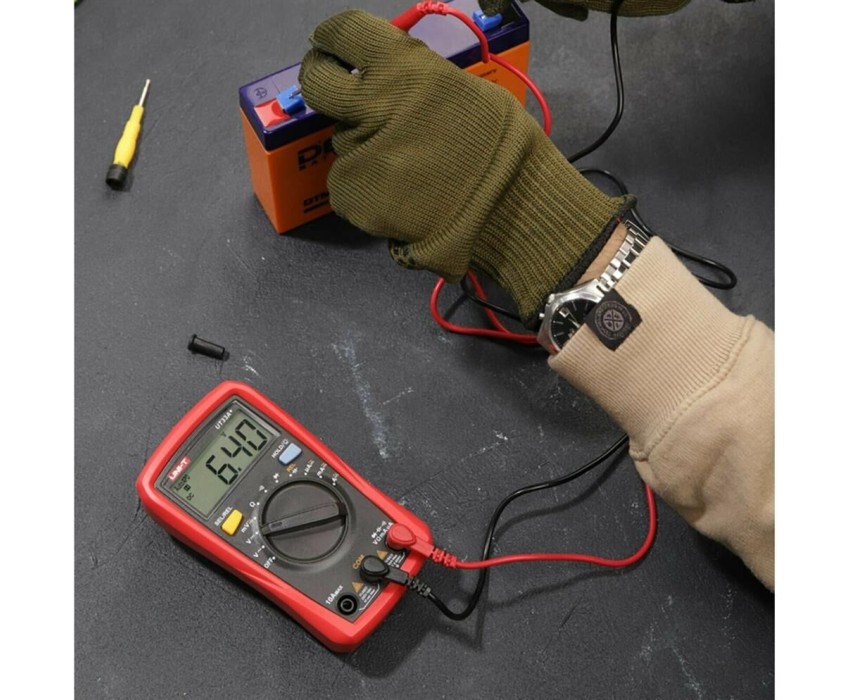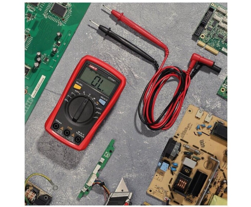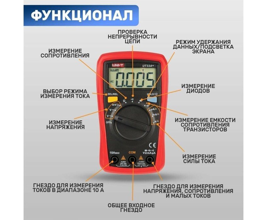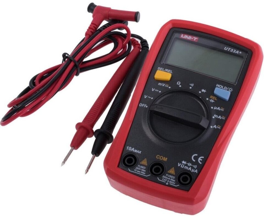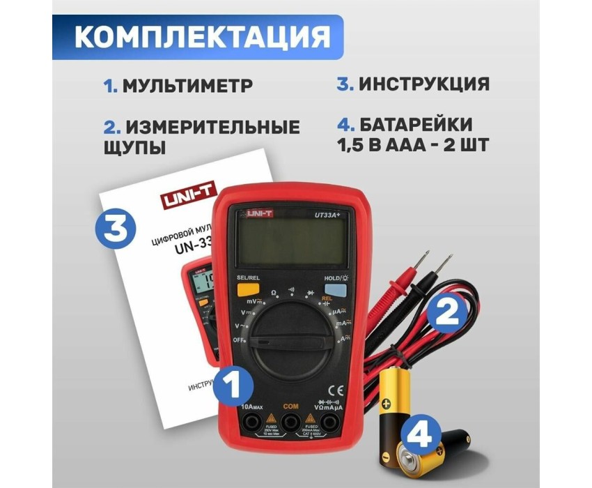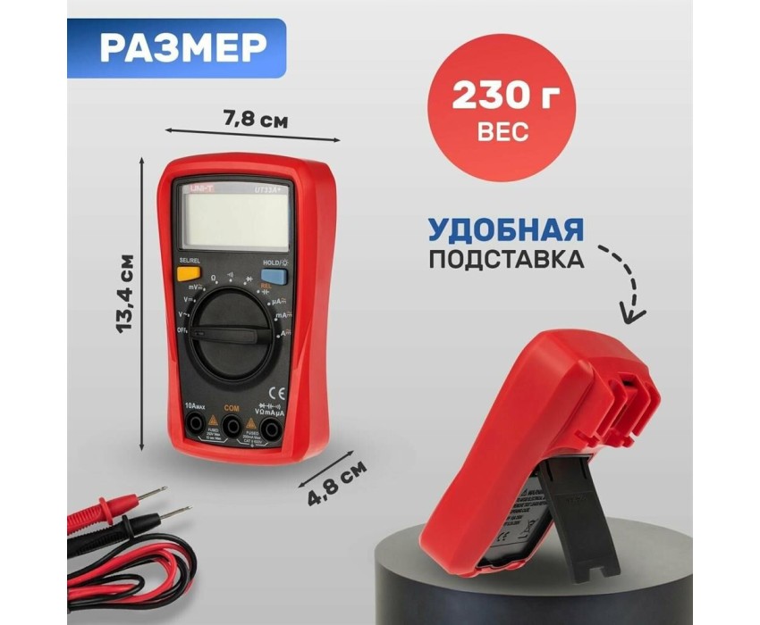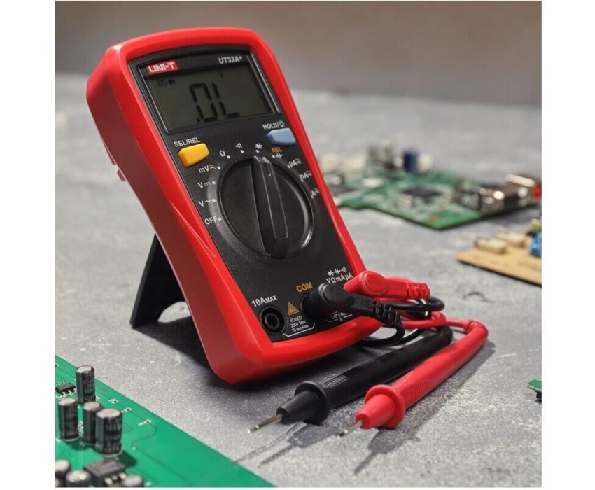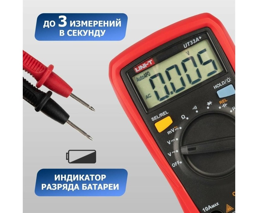 Мульти́метр — электроизмерительный прибор, который включает в себя несколько функций и набор измеряемых параметров. Все приборы серии UT-33+ измеряют постоянное и переменное напряжение, постоянный и переменный ток и сопротивление в цепи. А также с помощью данного прибора можно проводить тестирование диодов, транзисторов, батареек и осуществлять прозвонку целостности цепи. Прибор UT33A+ является портативным мультиметром, компактные размеры позволяют всегда носить его с собой. Но, несмотря на малые размеры, данный мультиметр обладает широким функционалом и это выгодно отличает его от других. Инженеры старались сделать прибор максимально удобным для использования. Выбор измеряемых величин производится с помощью усиленного поворотного регулятора, благодаря которому исключается возможность случайного нажатия. UT33A+ имеет функцию автоматического выбора пределов измерений.