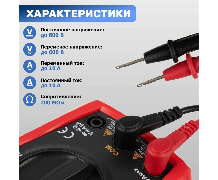 выявление повреждения проводки и соединения, измерение емкости конденсаторов, измерение переменного напряжения, измерение постоянного напряжения, измерение проводимости, измерение работоспособности диодов и транзисторов, измерение силы переменного тока, измерение силы постоянного тока, измерение сопротивления, проверка батареек под нагрузкой, измерение пост./перемен. напряжения