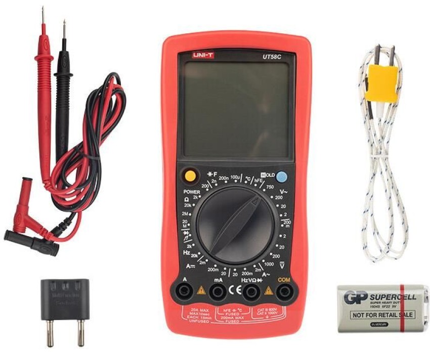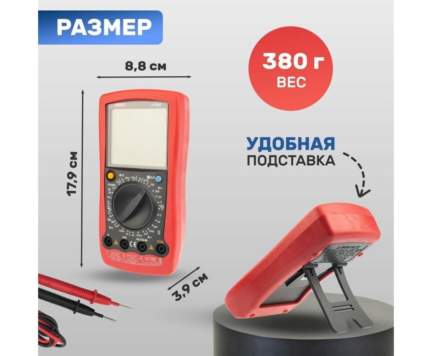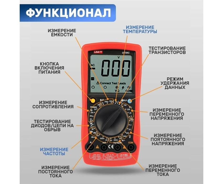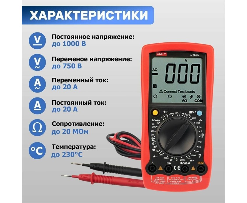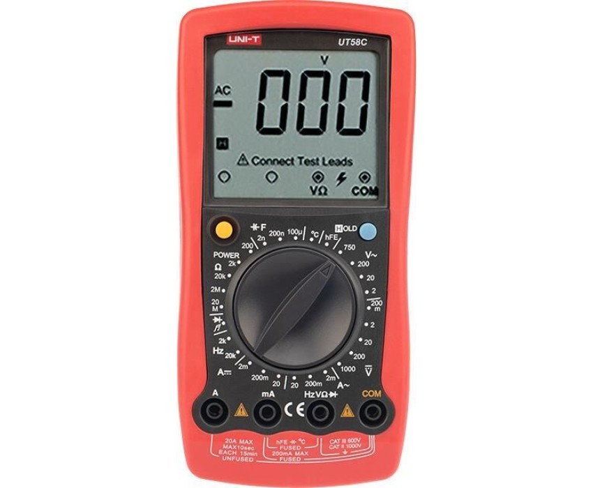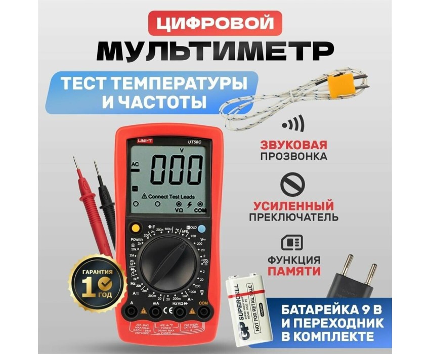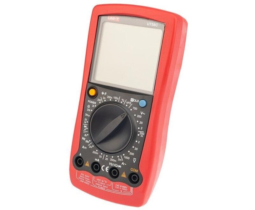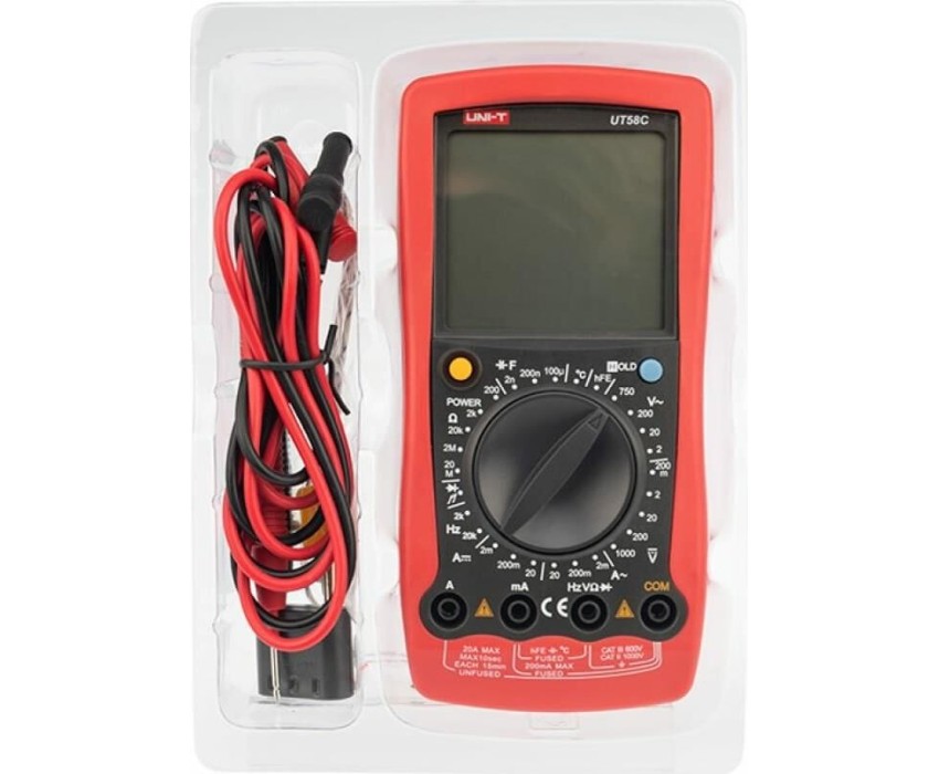 UT58C — это профессиональный мультиметр с современным и эргономичным дизайном. Предназначен прибор для измерений постоянного и переменного напряжения, сопротивления, постоянного и переменного тока. Кроме того, он имеет функции измерения электрической емкости, частоты температуры, а также с его помощью вы сможете тестировать диоды и проводить прозвонку целостности цепи. Данный прибор обладает высоким классом точности показаний. Дисплей прибора оснащен подсветкой, которая позволяет проводить измерения даже в слабоосвещенных местах. Широкий функционал мультиметра UT58C позволяет обходиться без других вспомогательных устройств. Прибор оснащен функцией DATA HOLD, и зафиксировав результат измерений, вы в любое время сможете считать полученный значение.