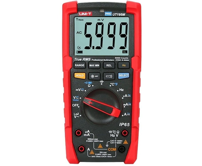 Тип: Мультиметр Бренд: UNI-T Модель: UT195M PartNumber/Артикул Производителя: UT195M Тип отображения: цифровой Цвет: красный Дополнительный цвет: черный Режим «прозвонка»: ДА Выбор диапазона измерений: автоматически/вручную Диод-тест: ДА Постоянное измеряемое напряжение (макс.): 1000 В Переменное измеряемое напряжение (макс.): 750 В Переменное напряжение, погрешность: 0.7 % Постоянный измеряемый ток (макс.): 20 A Переменный измеряемый ток (макс.): 20 A Сопротивление (макс.): 60 МОм Погрешность измерения сопротивления: 0.8 % Измеряемая емкость (макс.): 60 мкФ Частота (мин.): 60 Гц Частота (макс.): 40000000 Гц Диапазон измеряемых температур: от -40 до 1000 °С Кол-во элементов питания: 1 Тип элементов питания: 9V "крона" Ширина товара: 95 мм Высота товара: 195 мм Глубина товара: 58 мм Размеры: 95x195x58мм Вес товара: 437 грамм Степень защиты: IP65 Постоянное напряжение, погрешность: 0.7 % Погрешность силы постоянного тока: 1 % Погрешность силы переменного тока: 0.8 % Количество измерений в секунду: 3 Подсветка дисплея: ДА Комплект поставки: Мультиметр, тестовые щупы, аккумулятор, сумка для переноски, точечный контактный датчик температуры. Рабочее напряжение (макс.): 1000 В Функции и тесты: бесконтактный детектор напряжения, звуковая индикация, индикация полярности, функция True RMS Дополнительные функции: автоматическое отключение, защита от перегрузки, индикатор заряда батареи, режим памяти (HOLD) Дополнительно в комплекте: элементы питания Стандарты безопасности: CAT III 60…