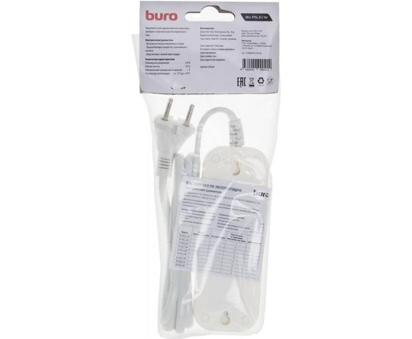 [Сетевые фильтры] BURO Сетевой удлинитель 3 розетки,1.5 метра, (BU-PSL3.1/W), белый (пакет ПЭ) {475331}
