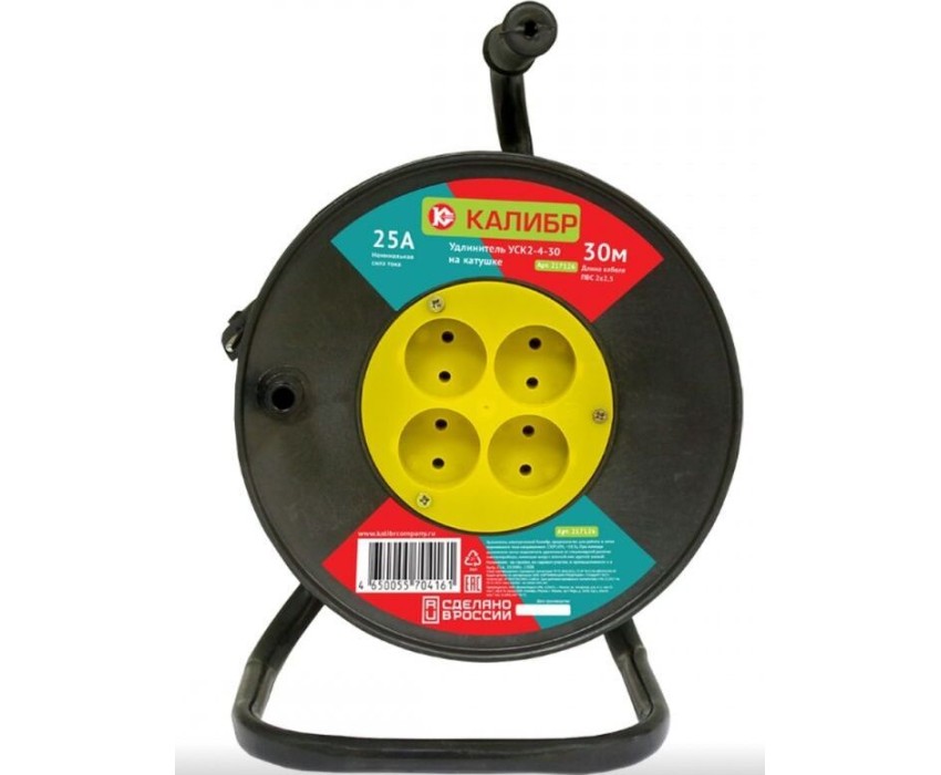 Удлинитель электрический "Калибр УСК2-4-30" на катушке предназначен для работы в сетях переменного тока напряжением 230±10%, ~50 Гц. При помощи удлинителя легко подключить удаленные от стационарной розетки электроприборы, имеющие шнур с плоской или круглой вилкой. Незаменим на стройке, на садовом участке, в промышленности и в быту. *в зависимости от поставки, внешний вид катушки может отличаться от представленного на фотографии. Сечение 2,5 мм2. Максимальная нагрузка 16 А, 3600 Вт. Длина кабеля 30 м.
