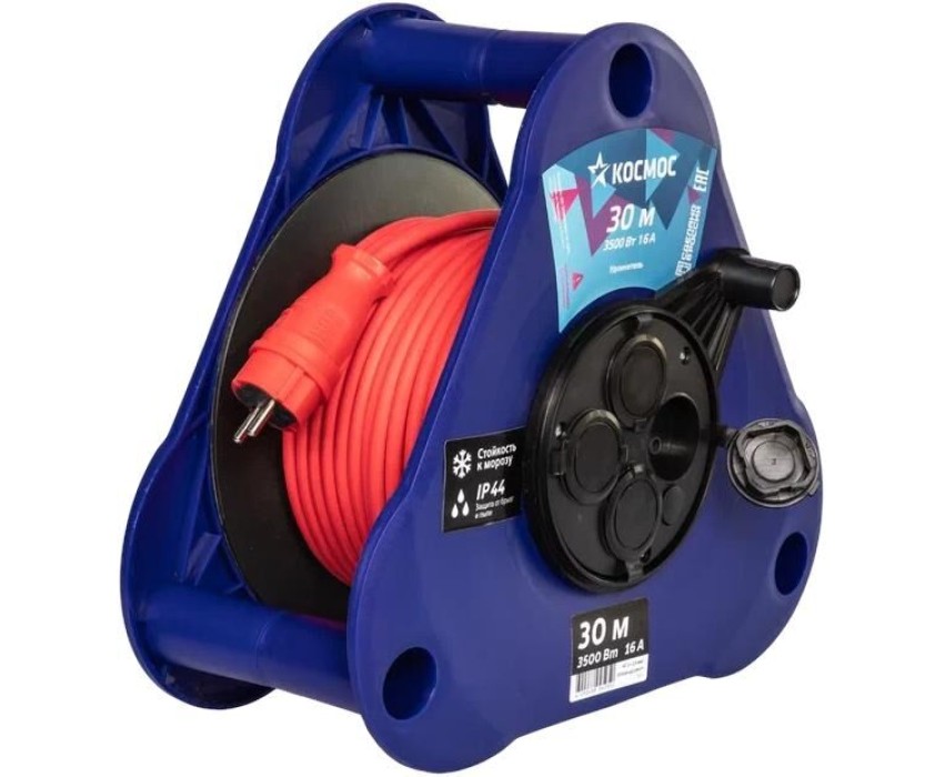 Удлинитель КОСМОС (катушка-треугольник) 16А 3500Вт 4 гнезда КГ 2*2,5 (30м) IP44 УКП. Новая треугольная конструкция-максимально устойчива и работает в любом положении, даже если опрокинется, каждая точка опоры может быть ручкой, провод не слетает с катушки. Удобство переноски и хранения. Морозостойкий провод КГ-ХЛ сечением 2.5 мм обладает повышенной износостойкостью. Морозостойкость до -35°С. Ярко-красный цвет провода. Яркий кабель-хорошо заметен в траве, пыли, снегу и в условиях плохой видимости. Защитные крышки для защиты от пыли и влаги. Катушки с KG кабелем комплектуются каучуковой разборной вилкой.