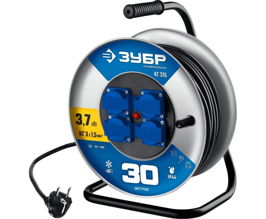 ЗУБР КГ-315, КГ, 3 x 1.5 мм2, 30 м, 3700 Вт, IP44, силовой удлинитель на стальной катушке, Профессионал (55080-30)