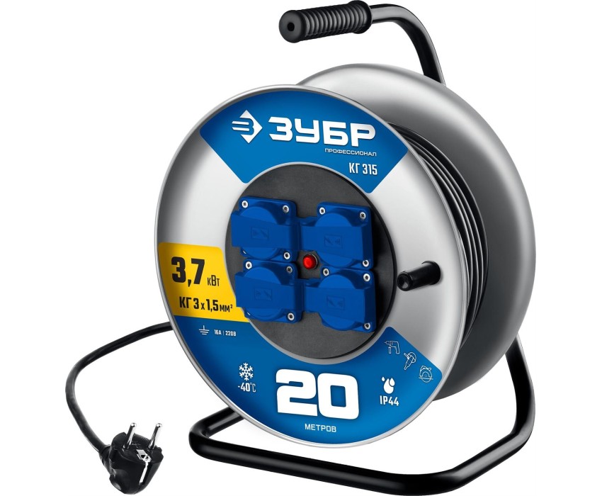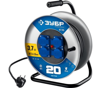 ЗУБР КГ-315, КГ, 3 x 1.5 мм2, 20 м, 3700 Вт, IP44, силовой удлинитель на стальной катушке, Профессионал (55080-20)