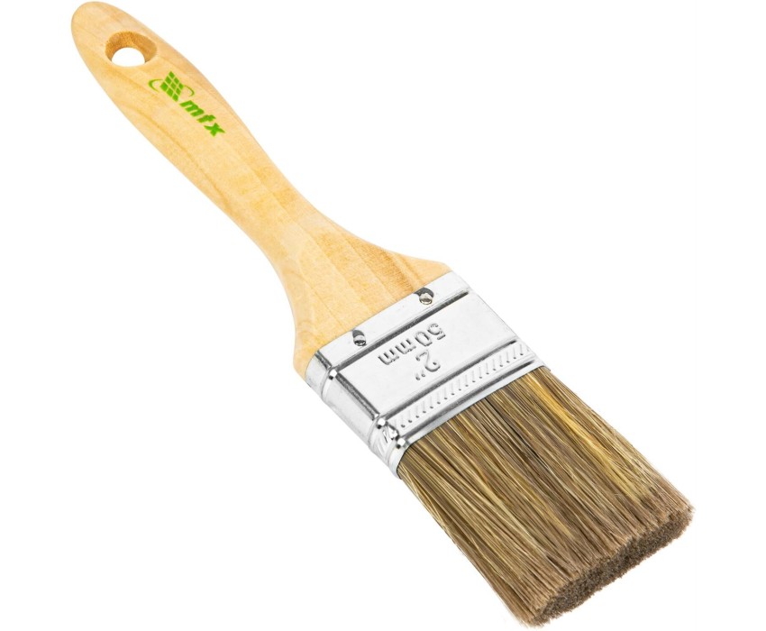 Плоская кисть MTX «Евро» 83079 шириной 2", с деревянной ручкой, имеет смешанную щетину и оптимальна для нанесения средств защиты древесины (пропитки, грунтовки, антисептиков, морилки). Сочетает все преимущества искусственной и натуральной щетины благодаря оптимальной комбинации натуральных и искусственных волокон. Обладает высокими краскообменными качествами: благодаря натуральной щетине в составе кисть хорошо впитывает и отдает краску. Инструмент подходит для профессионального использования. Преимущества Высокий ресурс — искусственный ворс не разбухает и не деформируется под воздействием воды, а натуральная щетина обеспечивает хорошую отдачу краски и устойчивость к любым типам ЛКМ. Защита от разрушения — на металлический бандаж нанесено антикоррозийное, а на деревянную рукоятку — матовое лаковое покрытие. Комфортная эксплуатация — деревянная рукоятка не скользит в руке во время работы. Эргономичность — рукоятка удобно ложится в руку, обеспечивая комфорт во время длительной работы. Ширина 50 мм — кисть удобна для обработки небольших участков и труднодоступных мест. Продуманное хранение — в рукоятке предусмотрено отверстие для подвешивания кисти на крючок или гвоздь.