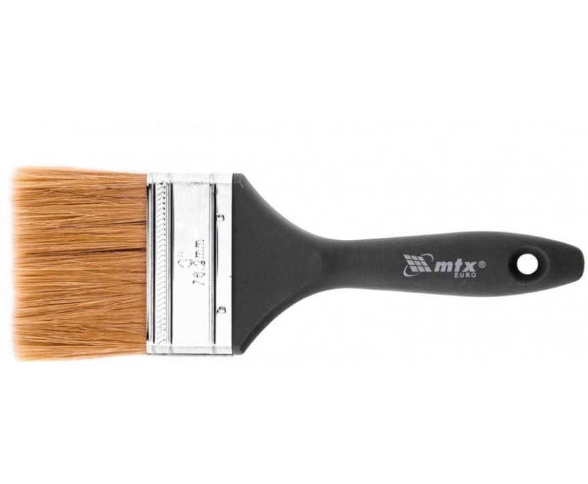 Плоская кисть MTX «Евро» 83066 шириной 3 дюйма, с натуральной щетиной и пластмассовой ручкой, используется для профессионального окрашивания поверхностей. Рекомендуется для нанесения агрессивных ЛКМ с содержанием растворителей. Преимущества Ширина рабочей части 75 мм — кистью удобно окрашивать участки большой площади. Прочность и долговечность — бандаж надежно скрепляет щетину с рукояткой, поэтому кисть выдерживает многократное использование. Высокое качество окрашивания — дважды вываренная щетина не содержит посторонних примесей, а расщепленные кончики увеличивают ее способность впитывать и отдавать краску. Коррозионная стойкость — защитное покрытие предотвращает разрушение бандажа под воздействием влаги. Эргономичность — пластмассовая рукоятка удобно лежит в руке, а специальное отверстие позволяет подвешивать кисть на гвоздь или крючок.