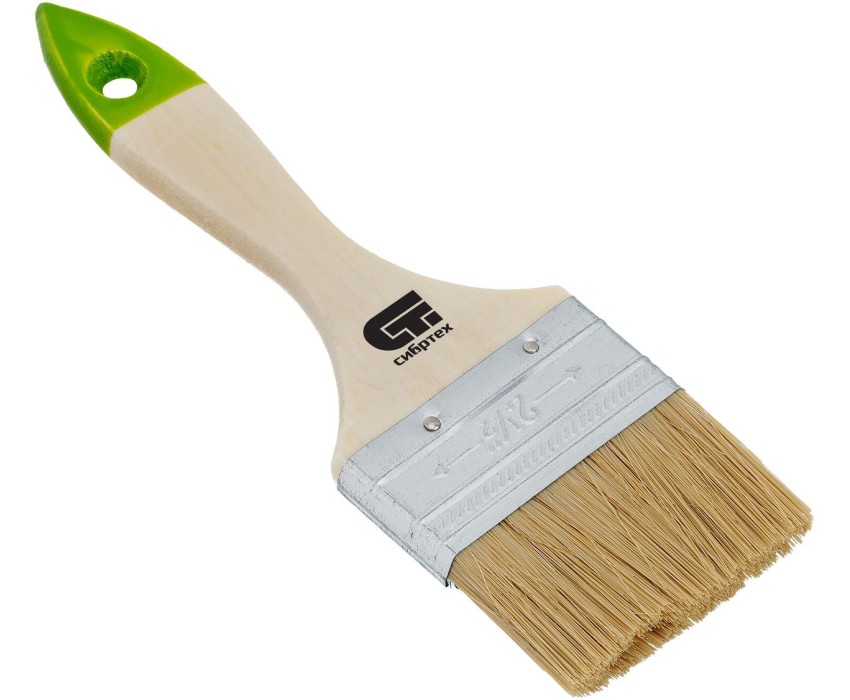 Плоская кисть Сибртех 82264 шириной 63 мм, с натуральной щетиной и деревянной ручкой, понадобится при окрашивании различных поверхностей. Ширина 63 мм делает инструмент оптимальным для окрашивания участков средней площади. Свиная натуральная щетина с добавлением искусственной подходит для большинства красок, в том числе масляных и на основе растворителей. Преимущества Эффективная работа — расщепленная на концах щетина повышает впитывающую способность кисти и улучшает отдачу краски. Высокое качество щетины — благодаря двойной выварке в ней не содержатся посторонние примеси и жир. Долговечность — металлический бандаж обработан антикоррозийным составом, а значит, кисть можно мыть под водой. Эргономичность — отшлифованная деревянная рукоятка удобно лежит в руке и имеет отверстие для подвесного хранения. Защита от рассыхания — рукоятка покрыта бесцветным лаком.