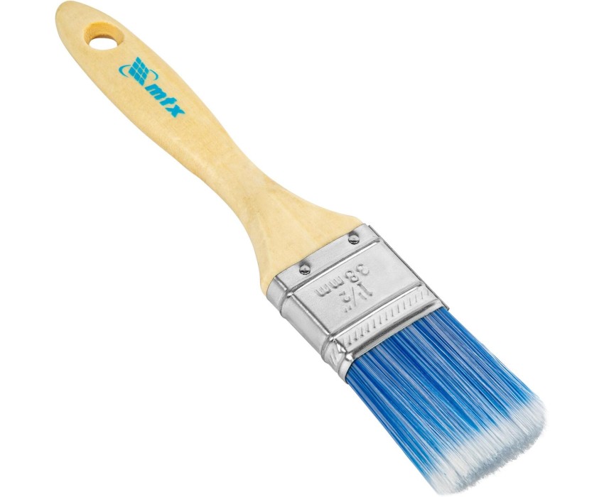 Плоская кисть MTX «Евро» 83070 шириной 1,5", с искусственной щетиной и деревянной ручкой, предназначена для малярных работ. Оптимальна для работы с водорастворимыми ЛКМ (акриловыми, латексными, водоэмульсионными), удобна для обработки узких и труднодоступных мест. Кисть подходит для профессионального использования. Преимущества Долговечность — искусственная щетина не разбухает и не теряет эластичность под действием воды, выдерживает многократное использование. Прочность — щетина крепко зафиксирована при помощи клеевого состава и металлического бандажа. Эффективная работа — расщепленная на концах щетина хорошо впитывает и отдает краску. Высокое качество выполняемых работ — благодаря волоскам конической формы кисть равномерно распределяет краску, позволяя получить гладкое покрытие. Коррозионная стойкость — на металлический бандаж нанесено защитное покрытие, а на деревянную рукоятку — матовый лаковый состав. Комфортная работа — эргономичная рукоятка удобно ложится в руку, позволяя долго работать без ощущения усталости. Удобное хранение — в рукоятке имеется отверстие для подвешивания кисти на крючок или гвоздь.
