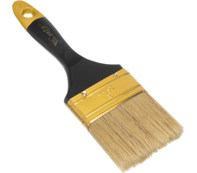 Плоская кисть «Профи» MTX 83154 шириной 3 дюйма, с натуральной щетиной и деревянной ручкой, рассчитана на профессиональное выполнение малярных работ. Натуральная щетина с увеличенной плотностью набивки подходит для нанесения различных типов ЛКМ, в том числе содержащих растворители. Преимущества Ширина 75 мм — кисть оптимальна для окрашивания поверхностей большой площади. Высокий ресурс — кисть премиум качества легко выдерживает интенсивное и многократное использование. Равномерное окрашивание — щетина двойной выварки не содержит посторонних примесей, а расщепленные кончики обеспечивают высокий показатель впитываемости и отдачи краски. Простой уход — кисть можно мыть, т.к. антикоррозийное покрытие защищает бандаж от разрушения. Комфортная работа — рукоятка из отборной древесины отшлифована и покрыта лаком, поэтому удобно лежит в руке. Практичное хранение — в рукоятке имеется отверстие для подвешивания на крючок.