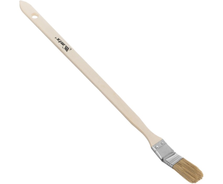 Радиаторная кисть MTX 83840 шириной 1", с натуральной щетиной и деревянной ручкой, используется для окрашивания радиаторов водяного отопления, металлических проволочных конструкций, труб, а также углов и стыков стен. Решение этих задач облегчает удлиненная ручка изогнутой формы. Натуральная щетина устойчива к агрессивным средам, поэтому кисть может применяться с эмалями и масляными красками. Преимущества: Высокое качество выполняемых работ — благодаря щетине с расщепленными кончиками кисть хорошо удерживает и распределяет краску, финишный слой получается ровным и гладким. Устойчивость к нагрузкам — щетина не выпадает, т. к. она надежно закреплена клеем, клиньями и металлическим бандажом. Возможность замачивания — защитное покрытие предохраняет бандаж от образования ржавчины. Комфортная работа — рукоятка из отборной древесины не выскальзывает из руки. Практичность — отверстие в рукоятке служит для подвешивания кисти и упрощает хранение.