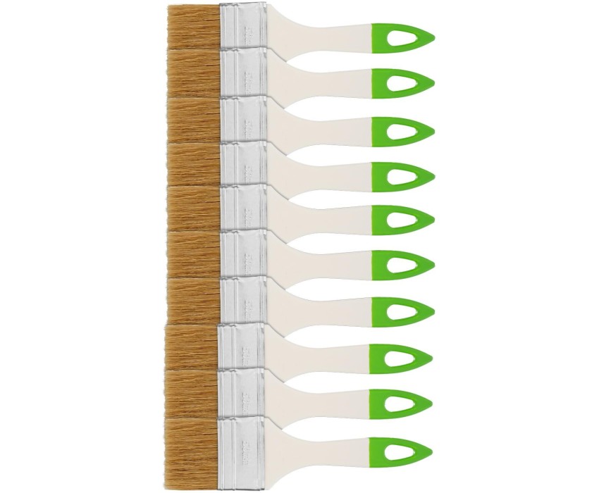 Флейцевая кисть Сибртех 82580 с щетиной шириной 50 мм и толщиной 8 мм предназначена для работы со всеми типами красок. Натуральная щетина устойчива к истиранию и воздействию растворителей. Преимущества Равномерное окрашивание — натуральная светлая щетина хорошо удерживает и распределяет краску. Долговечность — щетина надежно закреплена с помощью эпоксидной смолы, клиньев и бандажа, пластиковые клинья не деформируются при мытье или замачивании. Защита от разрушения — на бандаж нанесено антикоррозийное покрытие. Эргономичность — форма пластиковой рукоятки продумана таким образом, чтобы мастер не уставал даже при длительной работе. Удобное хранение — в рукоятке предусмотрено отверстие для подвешивания кисти. 10 штук в комплекте — набора хватит для выполнения большого объема задач.
