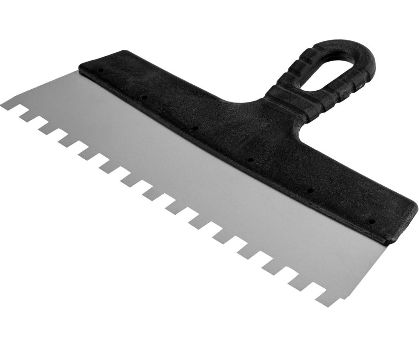 Шпатель Sparta 85130 из нержавеющей стали, шириной 300 мм, с пластмассовой рукояткой и зубьями 10 х 10 мм, применяется во время проведения работ по укладке плитки, мозаики и т. д. Квадратные зубья облегчают нанесение клеевого состава, позволяя равномерно распределять его по поверхности. Зубья размером 10 х 10 мм рассчитаны на плитку площадью 900-2500 см2. Преимущества Упругость — полотно быстро восстанавливает свою форму при изгибающих нагрузках. Коррозионная стойкость — рабочее полотно выполнено из нержавеющей стали. Комфортная эксплуатация — наклонная рукоятка облегчает нанесение и выравнивание раствора. Эргономичность — за счет рельефной текстуры рукоятка удобно ложится в руку и не выскальзывает из ладони. Удобное хранение — в рукоятке предусмотрено отверстие для подвешивания шпателя.