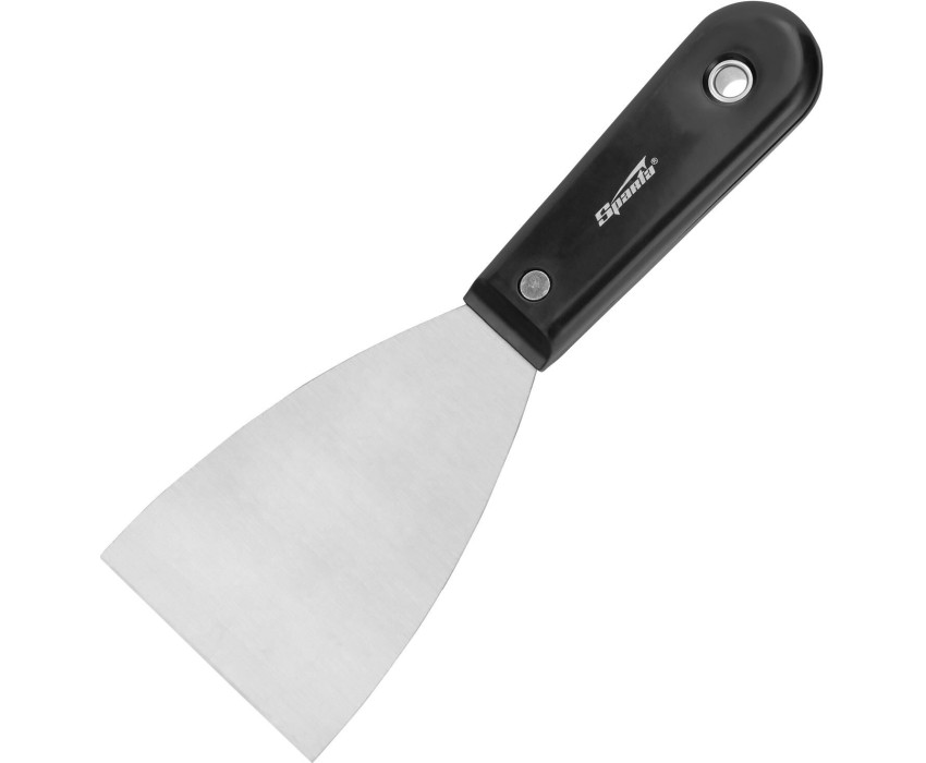 Стальная шпательная лопатка Sparta 852395 шириной 75 мм, полированная, с пластмассовой ручкой, станет незаменимым помощником при проведении строительных и ремонтных работ. Пригодится мастерам для нанесения, выравнивания и сглаживания различных клеевых и строительных растворов. Преимущества Одна лопатка для разных задач — за счет острого края полотном удобно удалять с поверхностей следы ржавчины. Коррозионная стойкость — рабочая часть покрыта защитным бесцветным лаком. Прочность и долговечность — полотно выполнено из углеродистой стали и надежно скреплено с рукояткой. Качественная работа — полотно отполировано, поэтому к нему не прилипает раствор, а обрабатываемая поверхность получается идеально гладкой. Небольшая ширина 7,5 см — шпателем удобно работать в труднодоступных местах. Комфортная работа — легкая пластиковая рукоятка удобно ложится в руку. Практичное хранение — в рукоятке имеется отверстие для подвешивания.