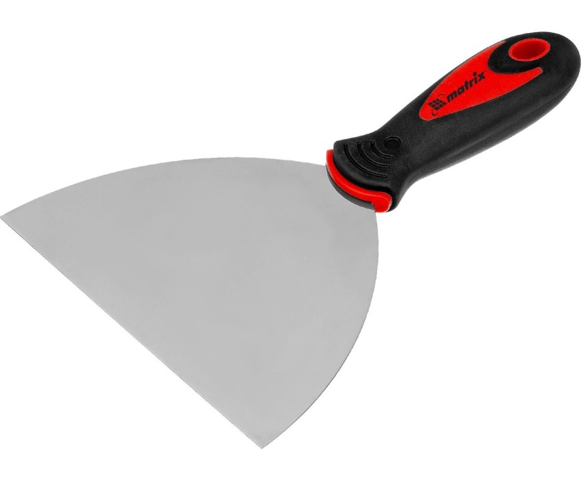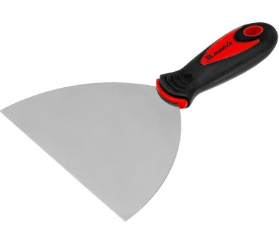 Шпательная лопатка из нержавеющей стали Matrix 85515 шириной 150 мм, с двухкомпонентной рукояткой, предназначена для нанесения и выравнивания строительных смесей, шпаклевания швов, заполнения трещин, удаления старых обоев. За счет компактных размеров инструмент подходит для корректировки мелких трещин и неровностей. Преимущества Высокий ресурс — профилированное полотно изготовлено из нержавеющей стали, отполировано и надежно соединено с рукояткой. Гибкость в сочетании с прочностью — термически обработанное рабочее полотно отличается высокой твердостью. Эргономичность — рукоятка анатомической формы с нескользящим покрытием обеспечивает надежный захват инструмента и комфортную работу. Отверстие для удобного хранения — лопатку можно вешать на крючок или гвоздь.