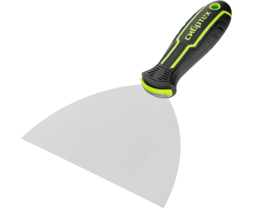 Шпательная лопатка Сибртех 85630 с полотном шириной 150 мм, изготовленным из нержавеющей стали, применяется для работы со строительными растворами: смешивания, нанесения и разравнивания шпатлевок, штукатурок, клеевых составов, затирок. Подходит для заделки трещин, устранения неровностей. Инструмент будет полезен при проведении строительных, ремонтных и отделочных работ. Преимущества Долговечность — полотно из нержавеющей стали обладает необходимой прочностью и устойчиво к коррозии. Деформационная стойкость — можно работать длительное время с высокими нагрузками без риска поломки инструмента. Эргономичность — двухкомпонентную рукоятку с рельефной поверхностью удобно держать в руке. Удобное хранение — в рукоятке предусмотрено отверстие для подвешивания на крючок.