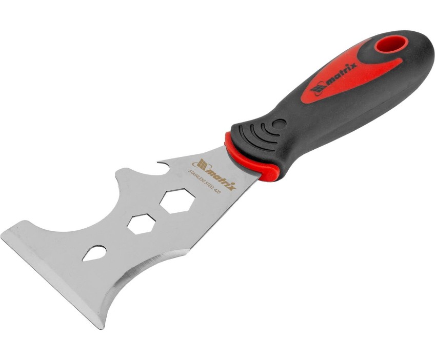 Многофункциональный шпатель-скребок Matrix 85558 9 в 1 с двухкомпонентной рукояткой имеет лезвие сложной конфигурации из нержавеющей стали. Используется для очищения поверхностей от шпатлевки, остатков цемента, зачистки труб и т. д. На жестком полированном полотне с лезвием шириной 75 мм предусмотрены выемки различной формы, благодаря которым инструмент можно использовать в качестве ключа на 11 и 15 мм, а также применять для очистки валиков, извлечения гвоздей, поддевания предметов, открывания банок с краской, равномерного нанесения смесей и выполнения прочих работ. Преимущества Надежная конструкция — полотно прочно зафиксировано в рукоятке, поэтому инструмент выдерживает интенсивные нагрузки. Комфортная работа — эргономичная двухкомпонентная рукоятка с прорезиненными вставками удобно ложится в руку и не выскальзывает из ладони. Удобное хранение — благодаря отверстию в рукоятке инструмент можно подвешивать на крючок или гвоздь.