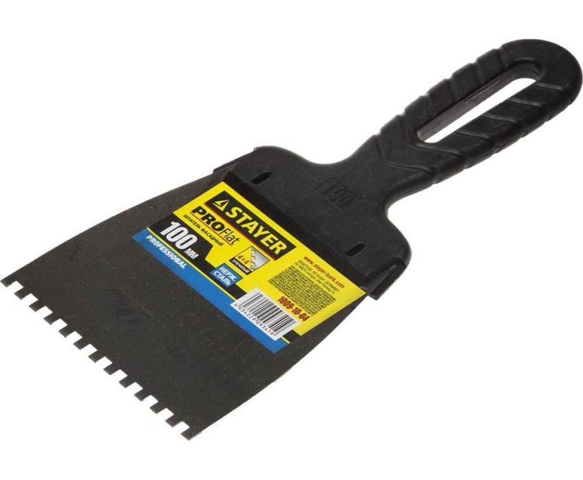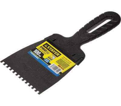 STAYER PROFlat, 100 мм, зуб 4 х 4 мм, пластиковая ручка, зубчатый, нержавеющий фасадный шпатель, Professional (1009-10-04)