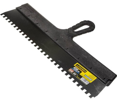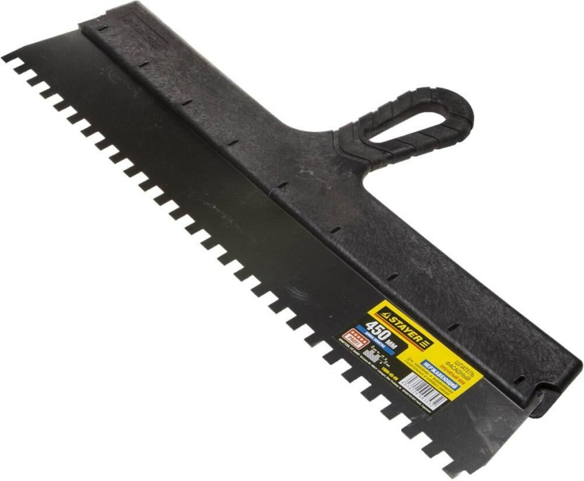 Благодаря зубчатой кромке шпатель идеально подходит для работы со строительными и клеевыми смесями, полотно из нержавеющей стали обеспечивает надежность и долгий срок службы, а удобная пластмассовая рукоятка создает условия для комфортной работы Преимущества Полотно из нержавеющей стали Пластмассовая ручка Размер зубьев 8х8 мм Ширина полотна - 450 мм Использование Для нанесения и выравнивания строительных и клеевых смесей