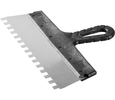 Благодаря зубчатой кромке шпатель идеально подходит для работы со строительными и клеевыми смесями, полотно из нержавеющей стали обеспечивает надежность и долгий срок службы инструмента, а удобная пластмассовая рукоятка создает условия для комфортной работы Преимущества Нержавеющее полотно Пластмассовая рукоятка Использование Для нанесения и выравнивания строительных и клеевых смесей