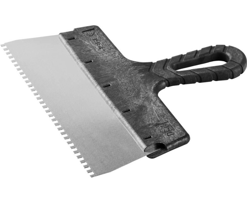 Благодаря зубчатой кромке шпатель идеально подходит для работы со строительными и клеевыми смесями, полотно из нержавеющей стали обеспечивает надежность и долгий срок службы инструмента, а удобная пластмассовая рукоятка создает условия для комфортной работы Преимущества Нержавеющее полотно Пластмассовая рукоятка Использование Для нанесения и выравнивания строительных и клеевых смесей
