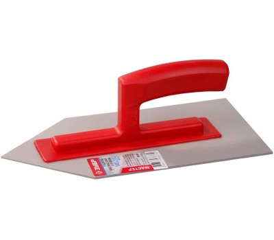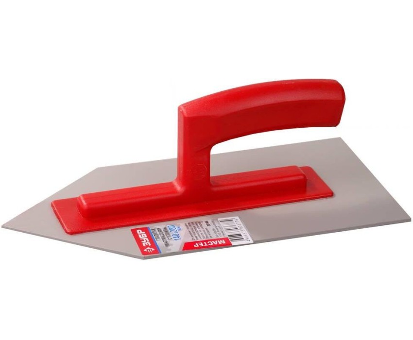 Инструмент произведен из ударопрочной пластмассы, которая позволяет добиться не только высокой эластичности полотна и ручки, но и повысить прочность всей конструкции в целом. Особенность данной модели - 1 сторона выполнена в виде клина Преимущества Специальная форма с уголком позволяющая работать в труднодоступных местах Использование Для нанесения и распределения штукатурных смесей и клеевых составов.