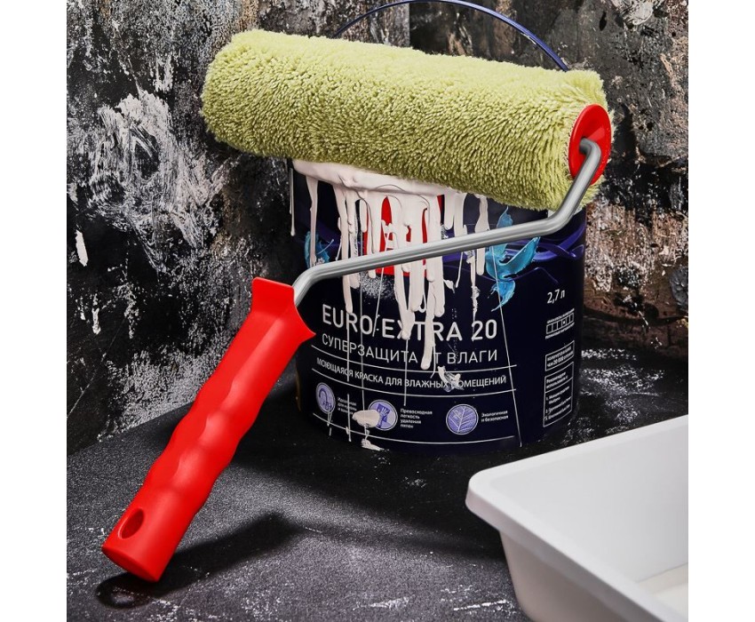 Валик состоит из пластмассового цилиндра, мягкой шубки, бугеля (изогнутого металлического стержня) и удобной пластиковой рукоятки.