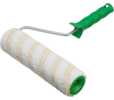 Валик Matrix «МИКРОФИБРА» 80773, 250 х 48 мм, с ворсом 12 мм из полиэстера и бюгелем 8 мм, используется для проведения подготовительных и малярных работ по дереву, стенам, потолкам. Он подходит для нанесения невязких материалов: пропиток, грунтовок, лазури, дисперсионных красок, антисептиков и др. Шубка с ворсом длиной 12 мм оптимальна для большинства поверхностей, в том числе шероховатых. Преимущества Высокое качество окрашивания — бесшовная шубка с остриженными краями не оставляет следов, хорошо впитывает и переносит краску, а благодаря свободно вращающемуся ролику валик максимально отдает ЛКМ на поверхность. Быстросъемное крепление — бюгель можно использовать с разными типами валиков, которые легко снимаются для очистки и замены. Прочность и долговечность — шубка приклеена на ролик с использованием технологии Termofusion, а бюгель оцинкован для предотвращения коррозии. Быстрое окрашивание больших поверхностей — валик имеет ширину 250 мм и диаметр 48 мм.