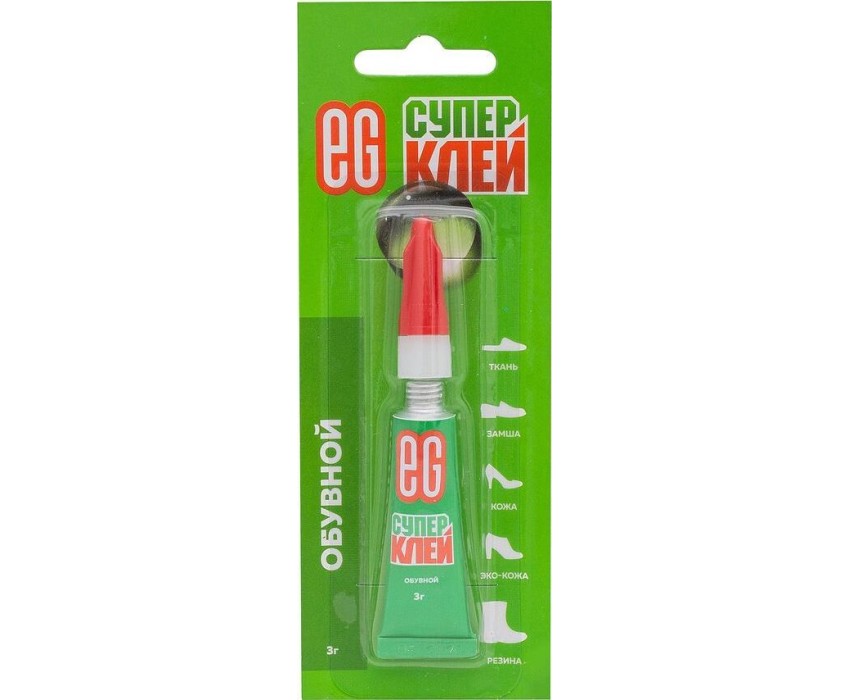 Клей обувной 3г. Область применения: быстрый ремонт обуви из различных материалов: кожи, кожзаменителя, резины, ткани и пр. Время схватывания: 3-5 минут, окончательная прочность – через 24 часа