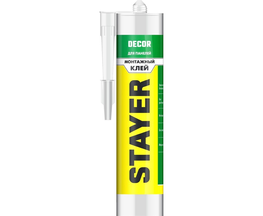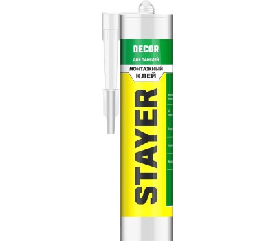 Монтажный клей Stayer незаменимый помощник при строительстве и ремонте Преимущества Легкий монтаж декоративных элементов. Обеспечивает водостойкое Эластичен Использование Применяется для внутренних и наружных работ. Склеивает в различных сочетаниях большинство строительных материалов: металлы, керамику, бетон, кирпич, дерево, пластик, пенопласт, любые типы панелей. Рекомендуется к использованию для приклеивания легких элементов декора (молдингов, лепнины, потолочной плитки, уголков, плинтусов, бордюров и др.) из пластика, пенопласта, ПВХ, резины, гипса и подобных материалов. Не рекомендуется применять для склеивания полиэтилена, полипропилена, тефлона и других подобных материалов.