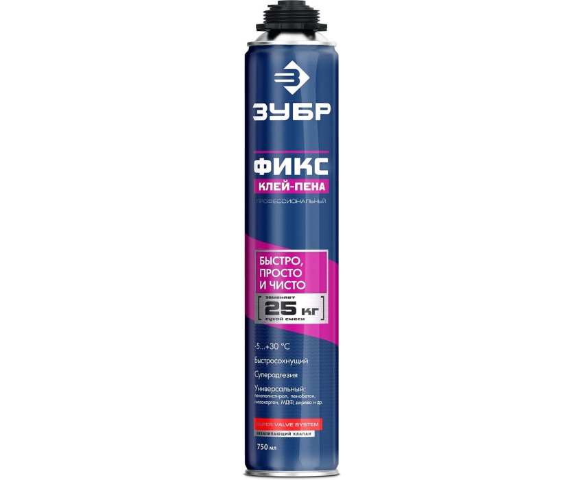 Однокомпонентный полиуретановый монтажный клей-пена ЗУБР обеспечит быстрое и надежное крепление различных строительных материалов. Используется с пистолетом. Преимущества Незалипающий клапан Низкий расход Всесезонная Обладает высокой адгезией к большинству строительных материалов (дерево, штукатурка, бетон, кирпич и т.д.), кроме тефлона, полиэтилена, полипропилена и силикона Увеличенный срок годности Отличный материал для тепло- и звукоизоляции. Использование Готовый к применению, однокомпонентный полиуретановый клей в аэрозольном баллоне. Предназначен для быстрого и прочного склеивания различных строительных материалов. Крепление материалов для утепления фасадов зданий и работ по теплоизоляции внутри помещений, крепления различных элементов отделки, приклеивание полистирольных плит, элементов декора из полиуретана и керамической плитки. Установка подоконников, откосов, монтаж МДФпанелей. Склеивание пазогребневых плит из пенобетона. Герметизация щелей между полистирольными плитами.