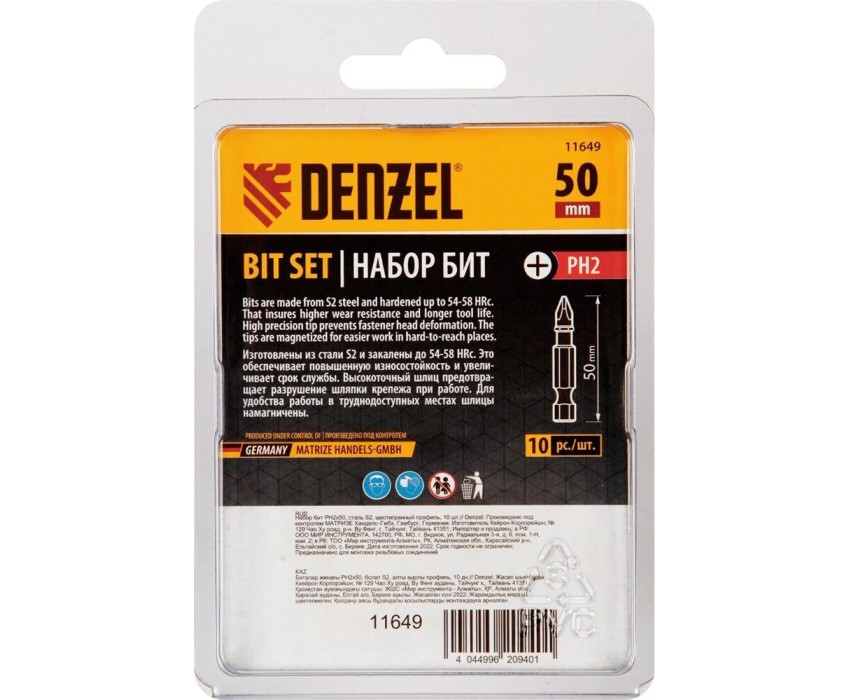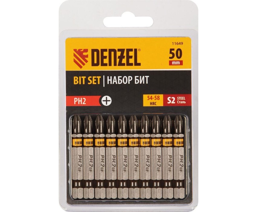 Набор бит DENZEL Набор бит PH2х50, сталь S2, шестигранный профиль, 10 шт. 11649