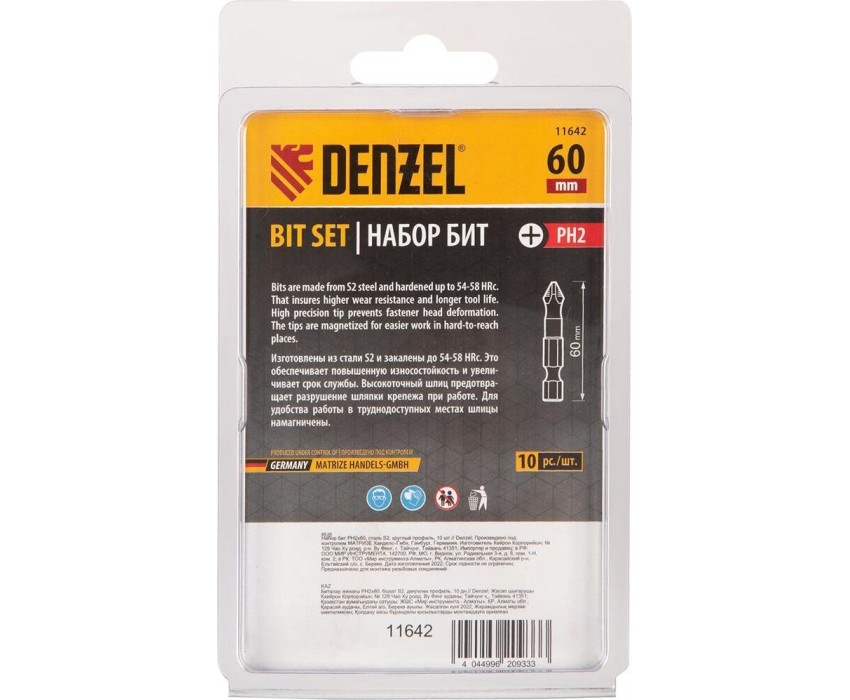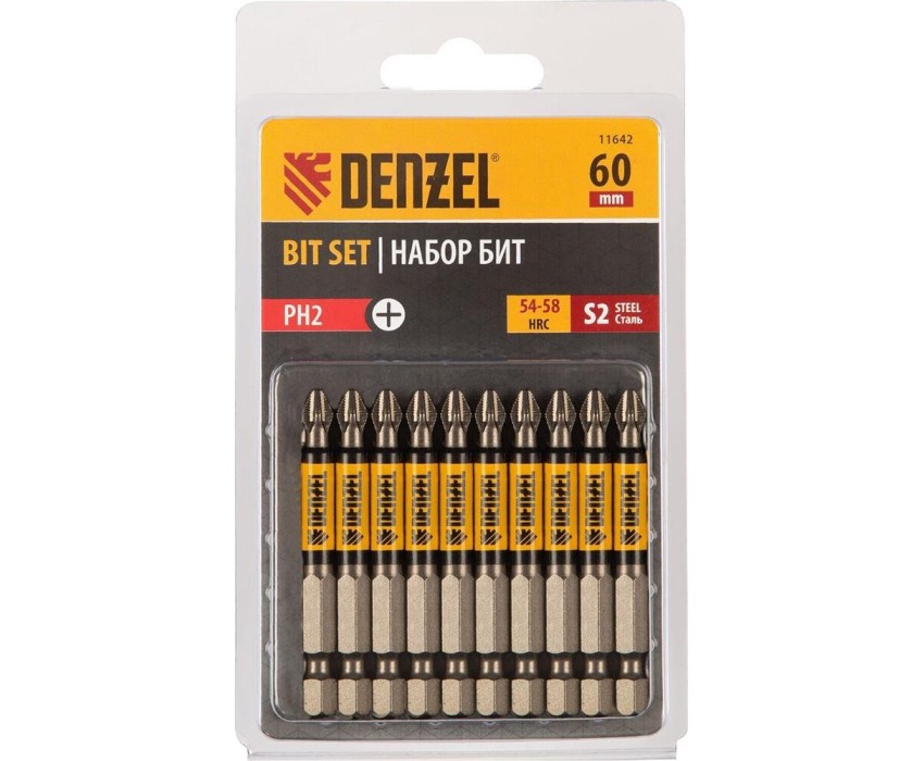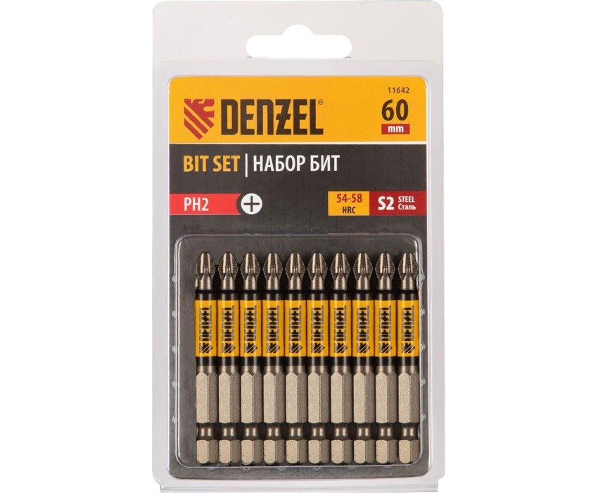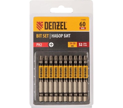 Набор бит DENZEL Набор бит PH2х60, сталь S2, круглый профиль, 10 шт. 11642