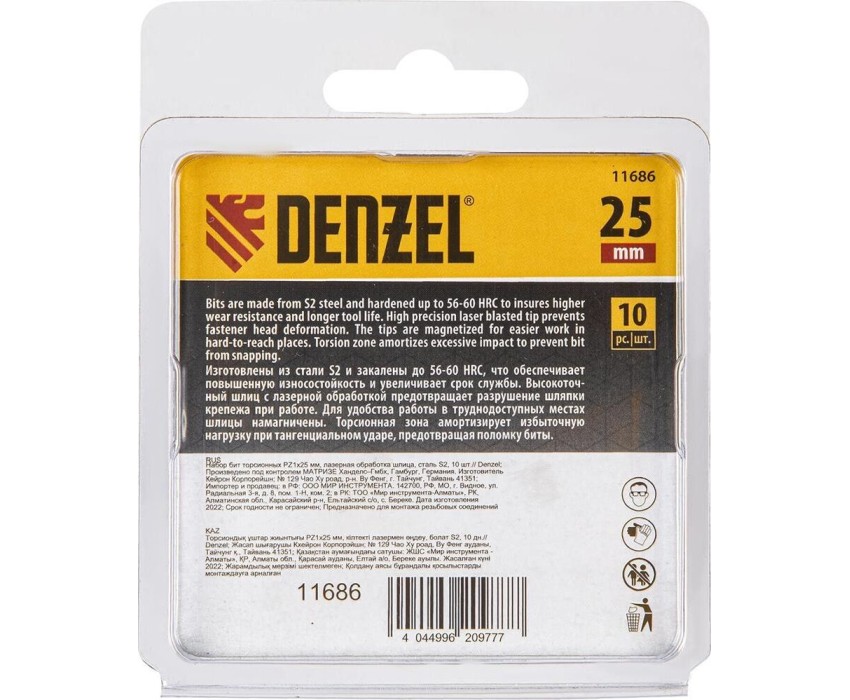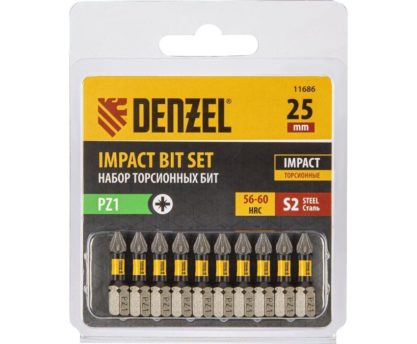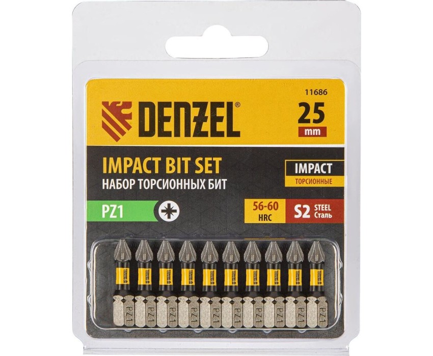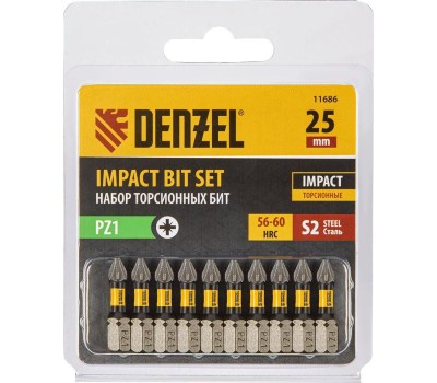 Набор бит DENZEL Набор бит торсионных PZ1x25 мм, лазерная обработка шлица, сталь S2, 10 шт. 11686