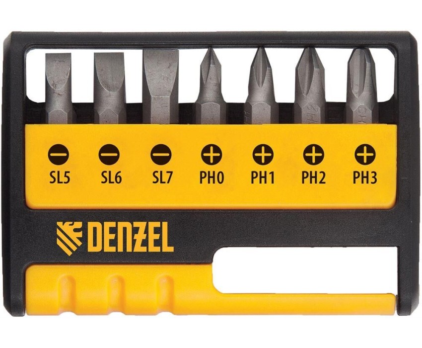 Набор бит Denzel 133577 состоит из 8 предметов: 7 бит 25 мм из легированной стали S2 и магнитного держателя. Используется для работы с крепежом со шлицами PH 0, 1, 2, 3 и SL 5, 6 и 7. Оснастка с идеальной геометрией выдерживает длительное использование без потери рабочих свойств. Преимущества Износостойкость — биты изготовлены из легированной стали S2, закалены до твердости 62 HRC, за счет чего устойчивы к деформации при больших нагрузках. Надежная фиксация — магнитный держатель надежно удерживает биты, поэтому они не выпадают во время работы. Намагниченный наконечник бит — бита надежно соединяется с головкой крепежа, что удобно для работы в труднодоступных местах Шестигранный хвостовик 1/4? — биты и магнитный адаптер можно использовать с другим подходящим инструментом. Удобное хранение и транспортировка — набор поставляется в прочном пластиковом футляре, который также может служить рукояткой во время работы.