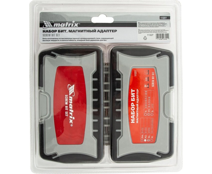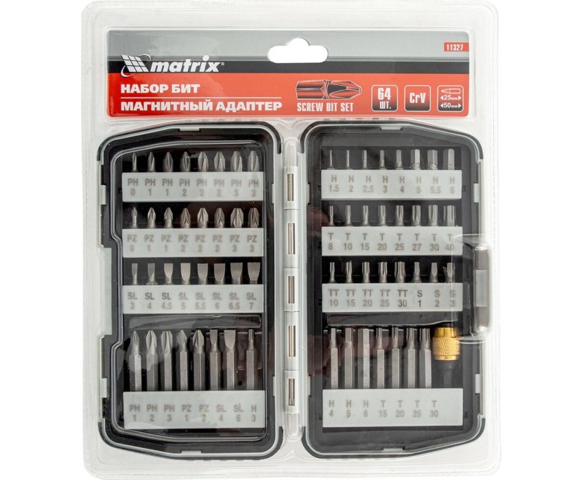 Набор бит MATRIX Набор бит, магнитный адаптер, CrV, пластиковый кейс, 64 шт. 11327