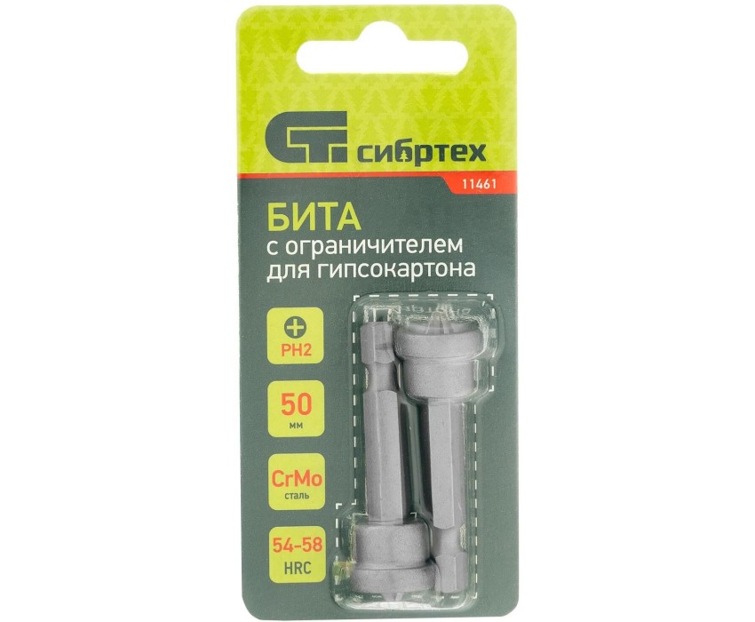 Бита для ГКЛ Сибртех 11461 из стали CrMo, типоразмера PH2 x 50 мм, с ограничителем, 2 шт. в уп.,
