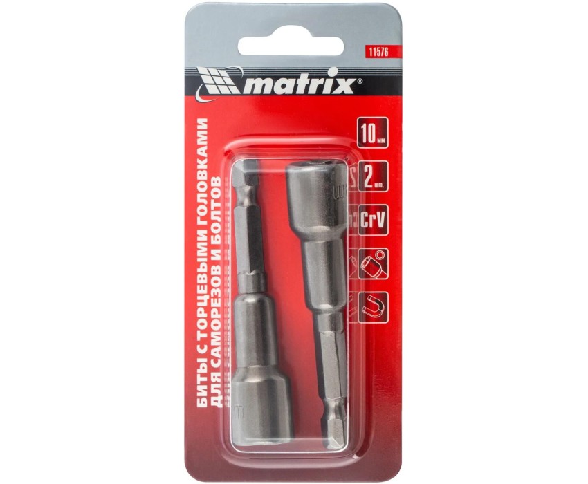 Биты с торцевыми головками Matrix 11576 размером 10 х 65 мм, 2 шт. в уп., предназначены для работ с шуруповертом.