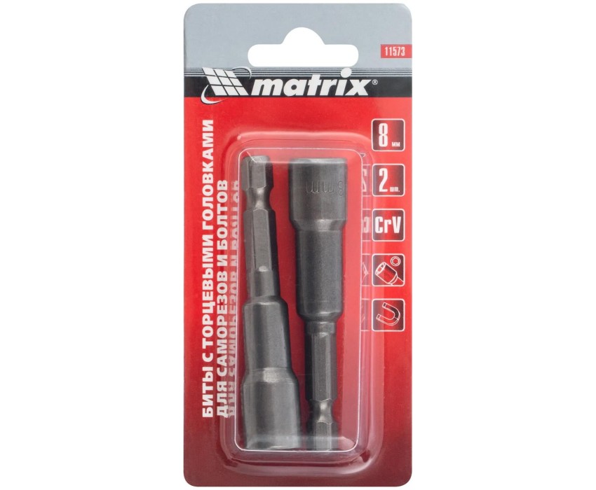 Биты с торцевыми головками Matrix 11573 размером 8 х 65 мм, 2 шт. в уп., предназначены для работ с шуруповертом.