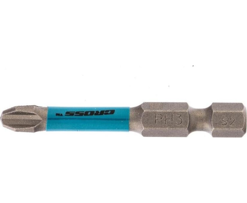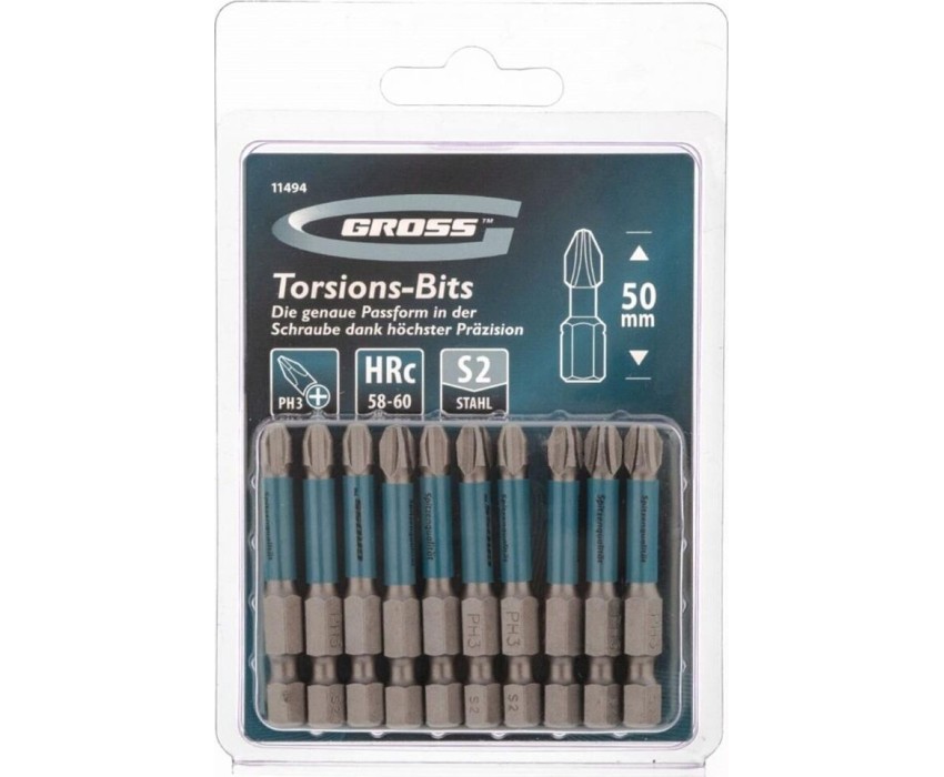 Набор торсионных бит PH3 x 50 мм Gross 11494, 10 шт., предназначен для монтажа и демонтажа резьбовых соединений с помощью ударного шуруповерта. Он незаменим в строительных, слесарных и монтажных работах, в автосервисах, при проведении ремонта в доме. Торсионная зона способна пружинить, за счет чего она частично амортизирует тангенциальный удар от шуруповерта. Такое решение позволяет равномерно распределить нагрузку по бите и избежать поломки шлица.ПреимуществаПродуманная конструкция — торсионная зона позволяет работать ударным шуруповертом даже с особо твердыми поверхностями без риска поломки бит.Высококачественный материал изготовления — японская легированная сталь S2 обеспечивает устойчивость бит к износу и увеличивает их ресурс.Износостойкость — биты закалены до твердости 58-60 HRC, что повышает сопротивляемость к деформации.Надежная фиксация насадок — шлицы бит намагничены, поэтому крепеж не выпадет, а мастер сможет свободной рукой придерживать закрепляемый материал.Защита от подделок — синее кольцо с логотипом ТМ Gross подтверждает оригинальность товара.Удобное хранение — насадки поставляются в блистере с европодвесом, который можно вешать на стенд.10 бит в комплекте — набора хватит на небольшую производственную бригаду.